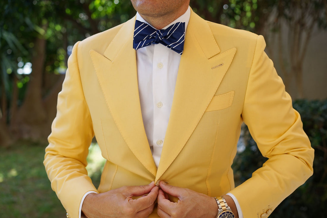 The Navy Blue Double Stripe Self Tie Bow Tie is an absolutely stellar classic, carefully crafted to lift your fashion game like a space shuttle into the stars. Enter any boardroom with the swagger of Gordon Gekko, nobody will even think twice. Heck, you’ll even make an 80’s mobile phone look good with this winner resting around your fine-pressed collar.