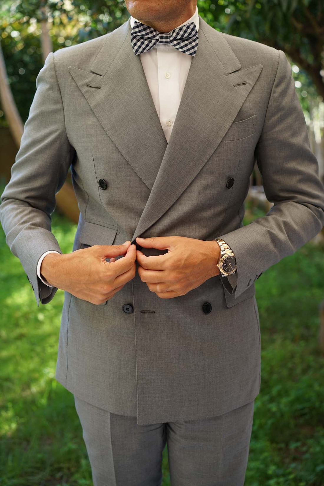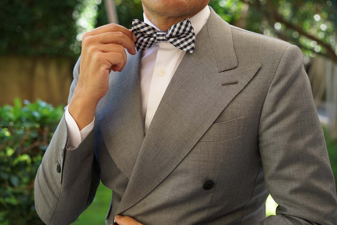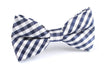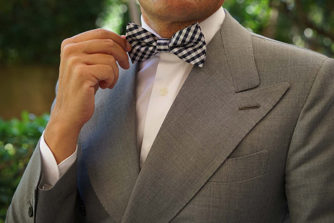 Designed by OTAA in Australia, the navy blue gingham checked bow tie has patterns of midnight blue and white, pinstriped throughout the design. The navy gingham bowtie displays thick and thin faded navy lines making for a distinctive pattern suited for any gentleman.