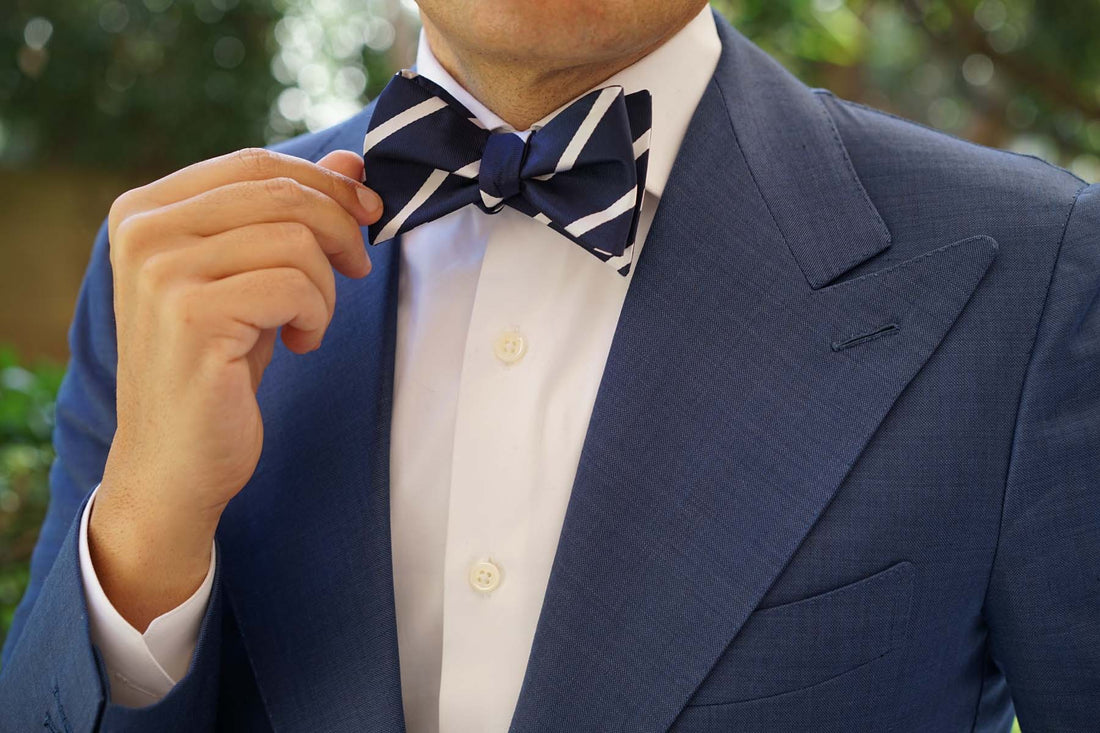 OTAA’s hand-sewn approach to tailoring ensures this untied bow tie delivers a high-quality presence as part of formal ensembles. The elegant diagonal striped pattern is paired with vertical embellishments to give your suits a textural asset. Wear the Navy Blue Pencil Stripe Self Tie Bow Tie to make a confident statement in the boardroom Designed exclusively by the Brothers at OTAA.