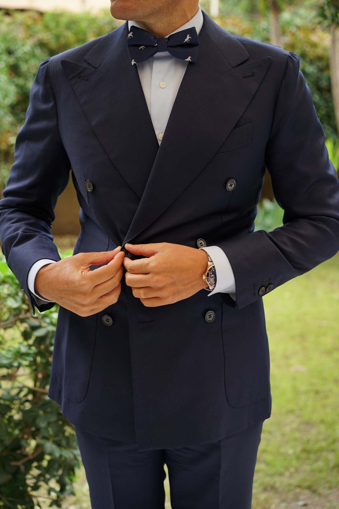 For the true horse lover or equestrian junkie, this Navy Blue Race Horse Bow Tie is sure to hit the spot. This Navy Blue Race Horse Bow Tie features a pattern of white horses against a navy background. This Bow Tie will show the world that you take pride in caring for your horse in and out of the racetrack.