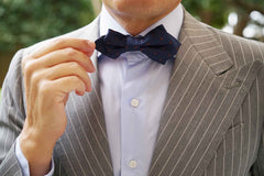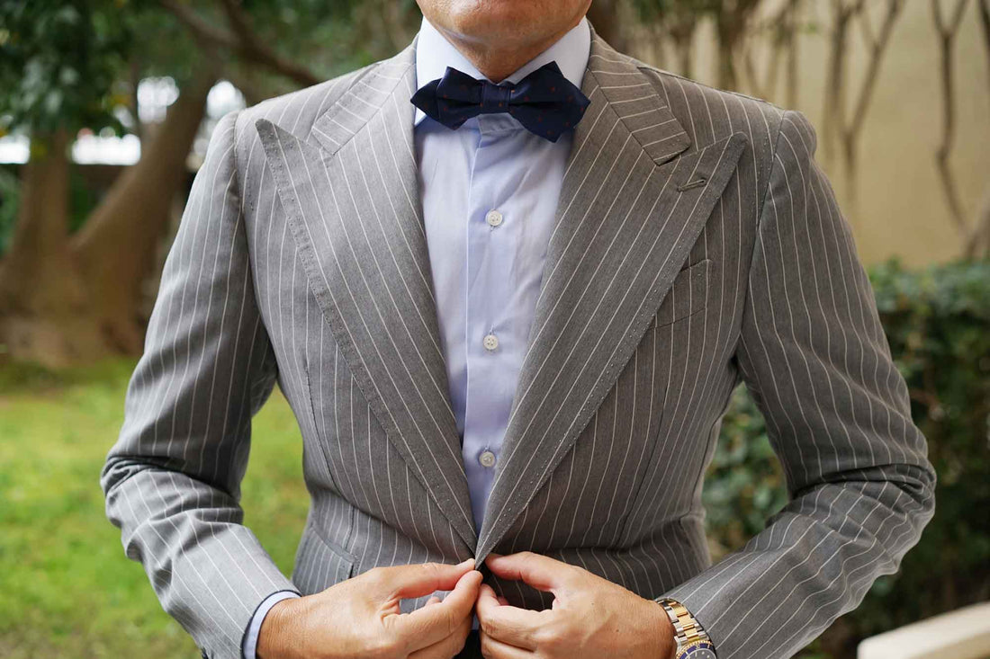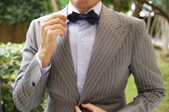 Designed with a vintage outlook, the Navy Blue with Brown Polka Dots Diamond Bow Tie by OTAA is a charming cornerstone for versatile fashion. Kitted out with hand-embroidered polka dots upon a navy blue lined fabric, this Navy Blue with brown Polka Dots Diamond Bow Tie is brimming with intricate texture. Going beyond design, this diamond bowtie is underpinned by OTAA's high-quality tenets. Designed in-house and stitched by hand; there's no doubt this diamond bowtie is both stylish and luxurious in equal proportions. Let it give you a formal flourish at formal engagements. Designed exclusively by the Brothers at OTAA.