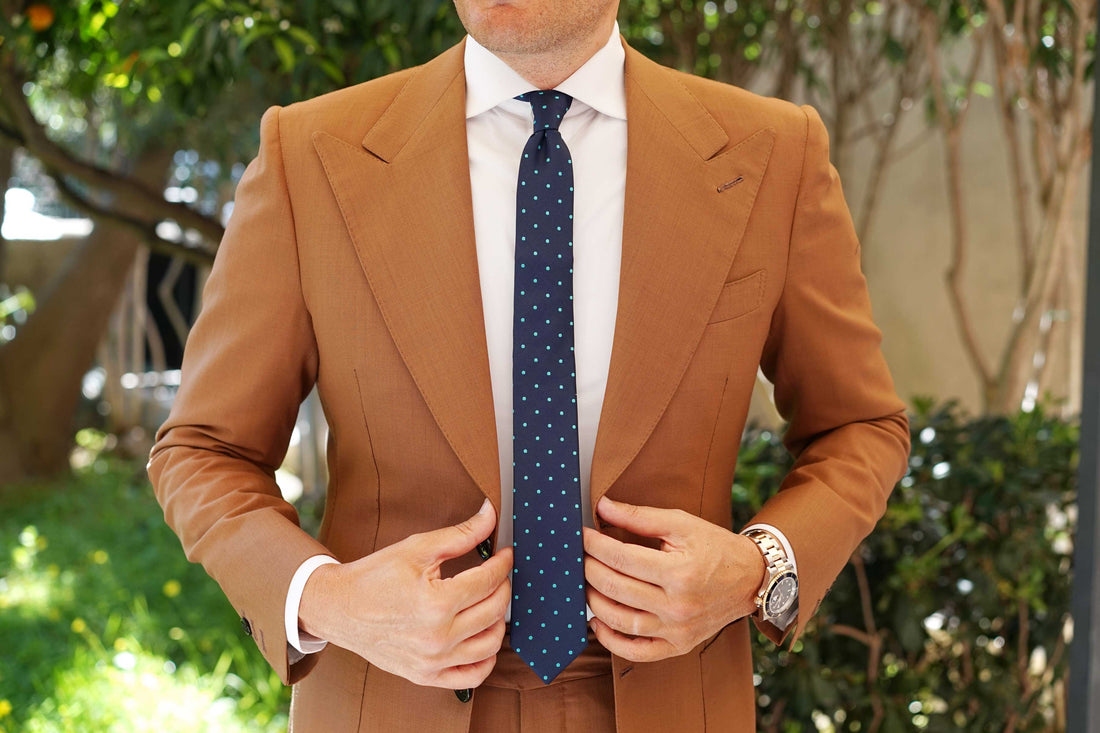This unsuspecting polka dot tie will give your wardrobe the lift that you've been seeking. The Navy Blue with Mint Blue Polka Dots Skinny Tie features a playfully scattered array of blue dots on a navy background. The lightweight material makes it a great option for every day of the year.