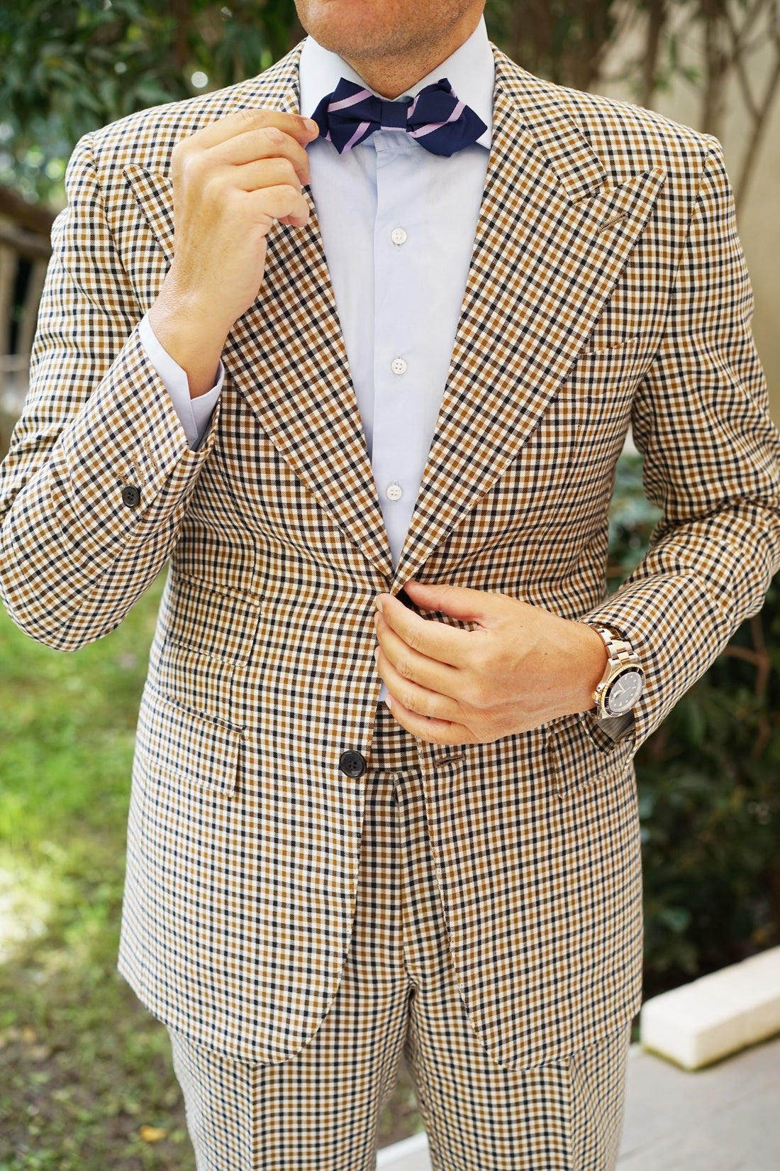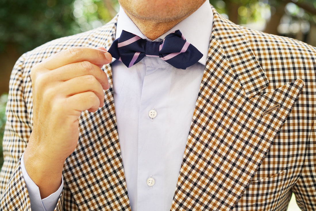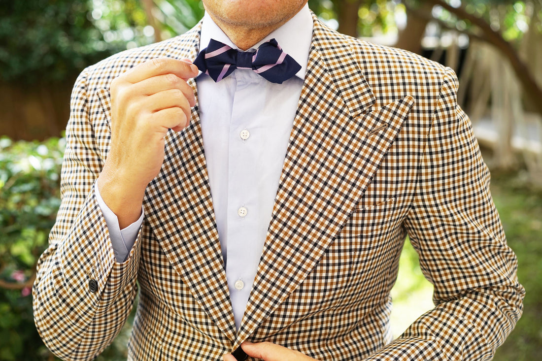 Amp up your office suiting with the corporate stripes of OTAA's Navy Blue with Purple Stripe Diamond Bow Tie. Showcasing the label's signature navy blue, this Navy Blue with Purple Stripe Diamond Bow Tie is a perfectly understated garment that will bode superbly with boardroom styles. Let its diagonal purple stripes give you a confident appeal when you walk through the door, and its lined backing gift you an enhanced level of texture. Restrained albeit highly sophisticated, this diamond bowtie is undoubtedly one of the most versatile pieces you can possibly buy; and having been designed in-house and stitched by hand, it's nothing short of luxurious too. Designed exclusively by the Brothers at OTAA.