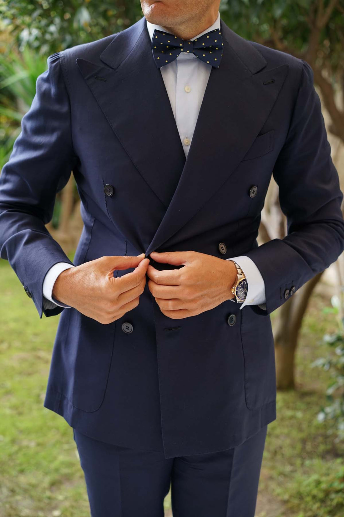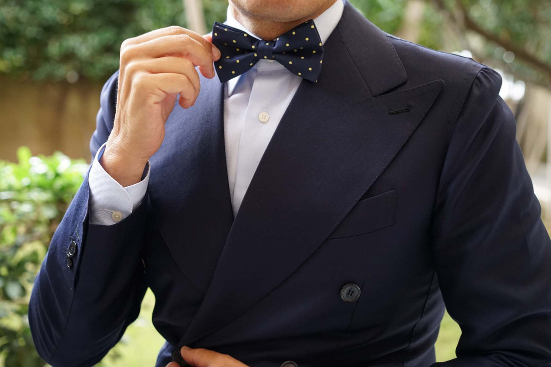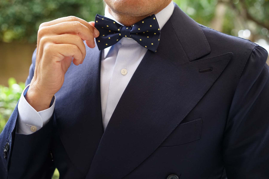This Navy Blue with Yellow Polka Dots Bow Tie is a classic style that looks fresh, sharp and modern. Crafted from textural micro material in deepest navy and finished with smooth polka dot pattern, this piece is a sophisticated option for smart events. Add with a complementary pair of trousers, a white shirt and glossed Oxfords, accessorising with your choice of cufflinks and pocket chief. Designed exclusively by The Brothers at OTAA.