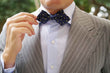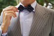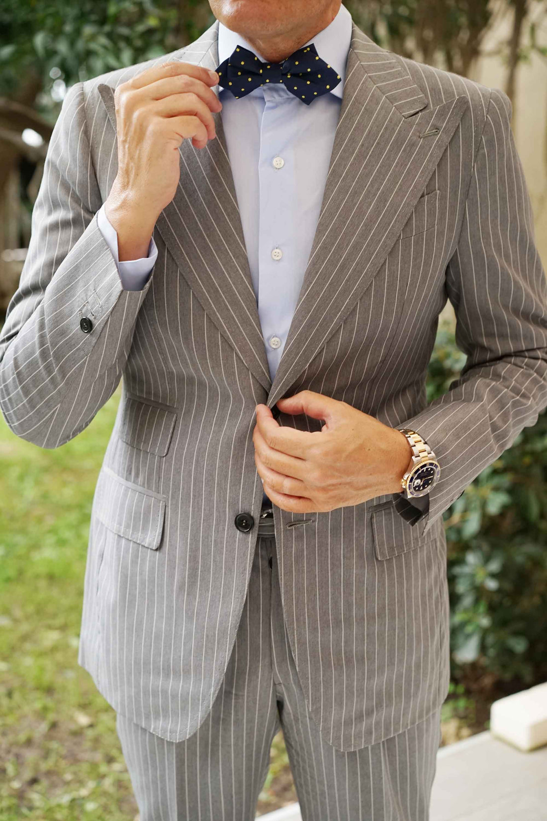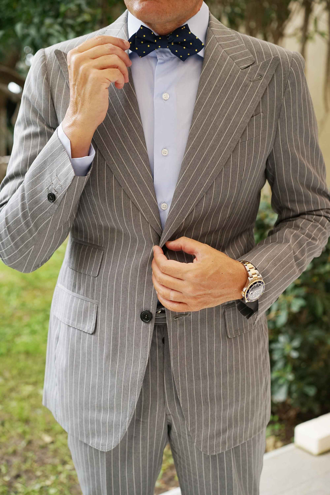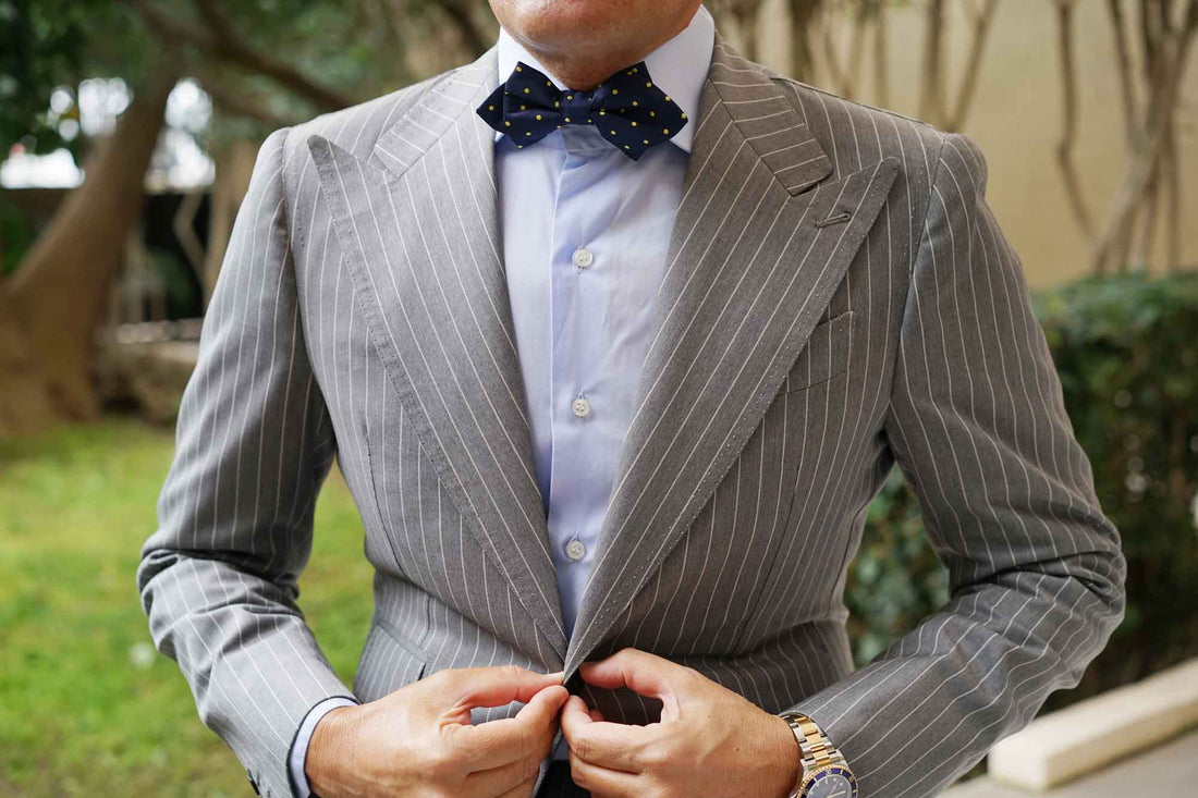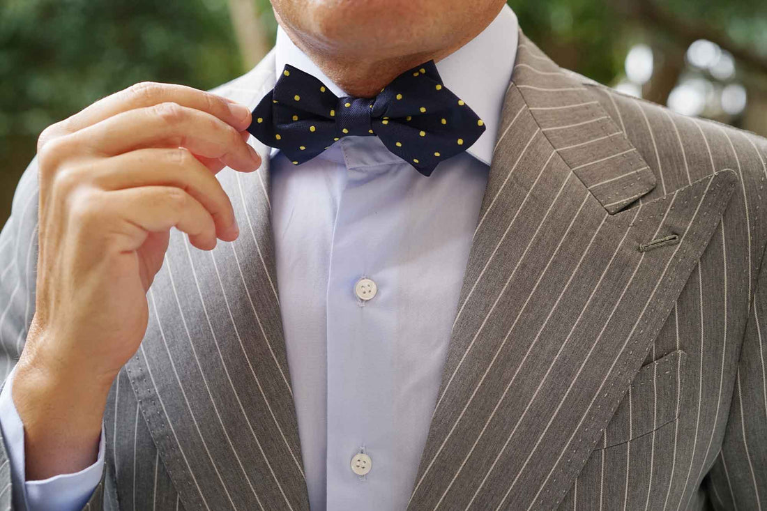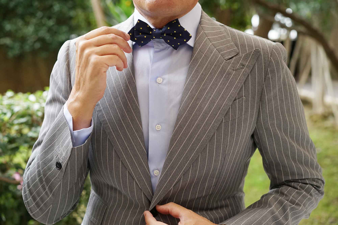 With an aptitude for frivolity, the Navy Blue with Yellow Polka Dots Diamond Bow Tie makes a superb asset for lasting impressions. Imbued with the label's signature navy hue, this diamond bowtie is fabulously hand-embroidered with charming yellow polka dot motifs. With hand-stitched details and an impeccably tailored fabric; this Navy Blue with Yellow Polka Dots Diamond Bow Tie makes a versatile cornerstone in the wardrobes of men who value quality. Let its textured fabric gift you an enhanced point of difference when you suit up for formal engagements. Designed exclusively by the Brothers at OTAA.