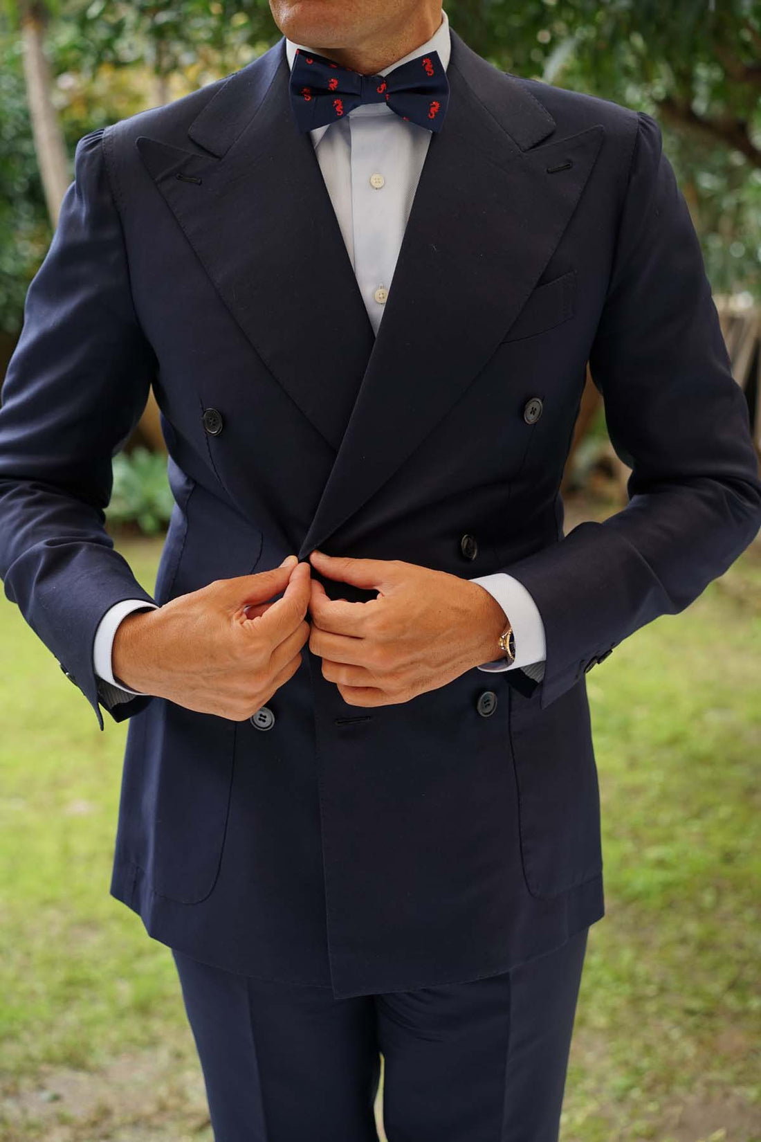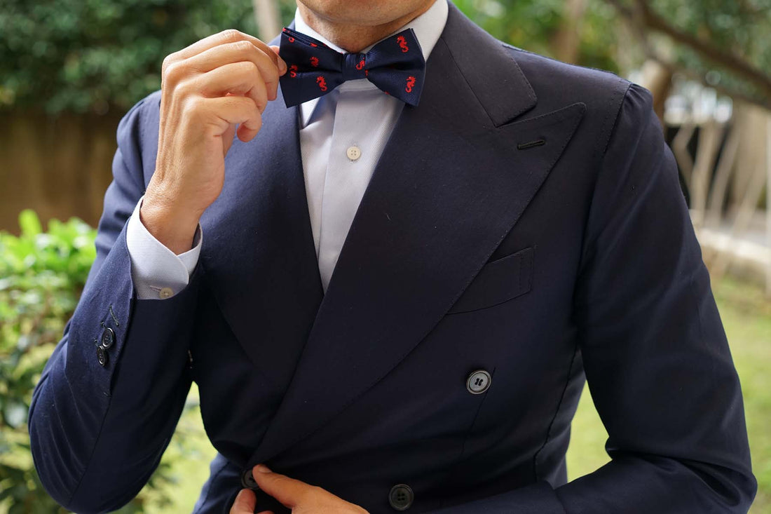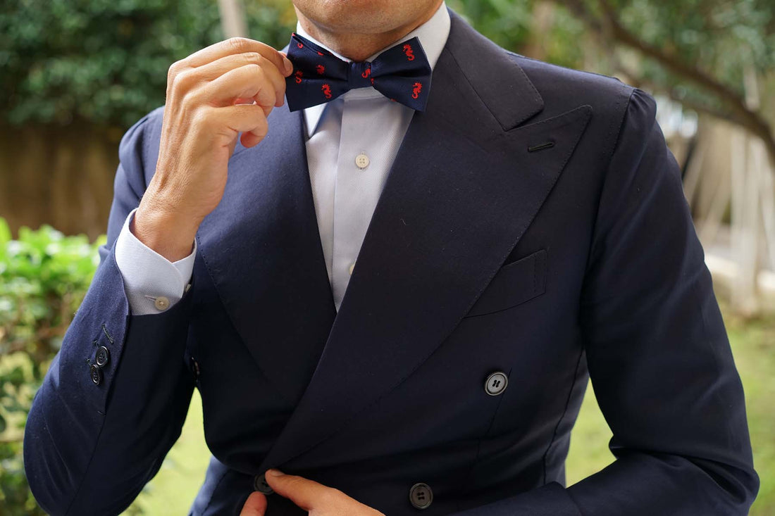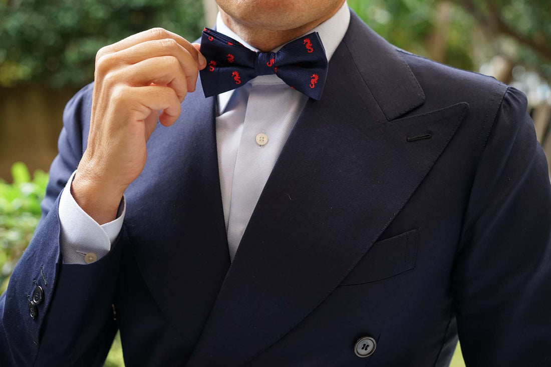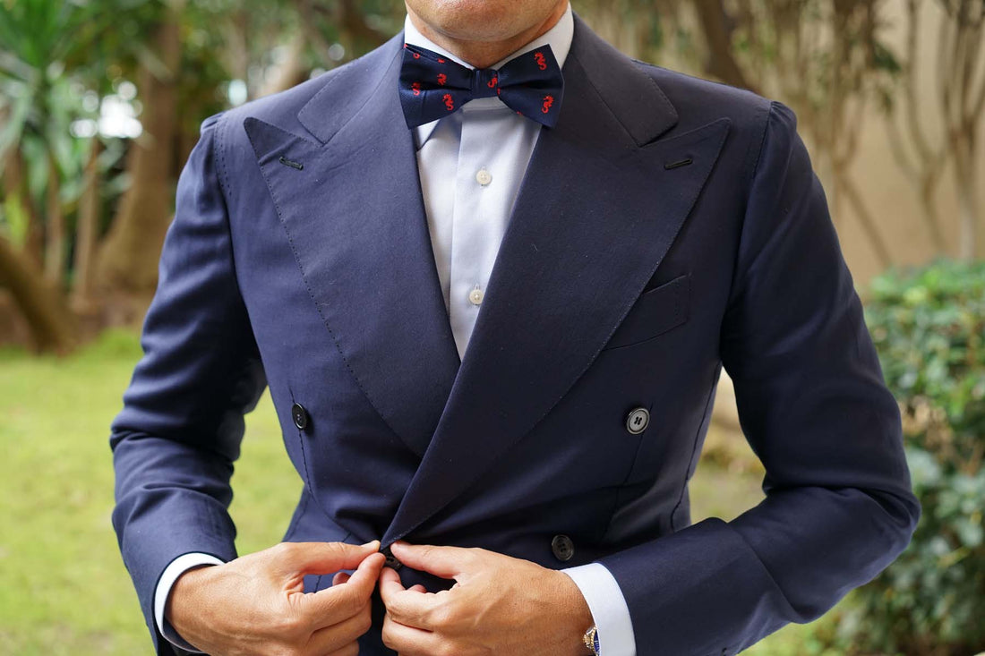 The Brothers at OTAA prize world-class tailoring, which is why this Pacific Seahorse Pre-tied Bowtie is constructed by hand from an exceptional navy blue fabric. The ebullient red and navy hues ensures this bow tie brings an eye-catching staple to your daily ensembles. Wear this Pacific Seahorse Bow Tie to accomplish a playful accent in your tailoring. Designed exclusively by the Brothers at OTAA.