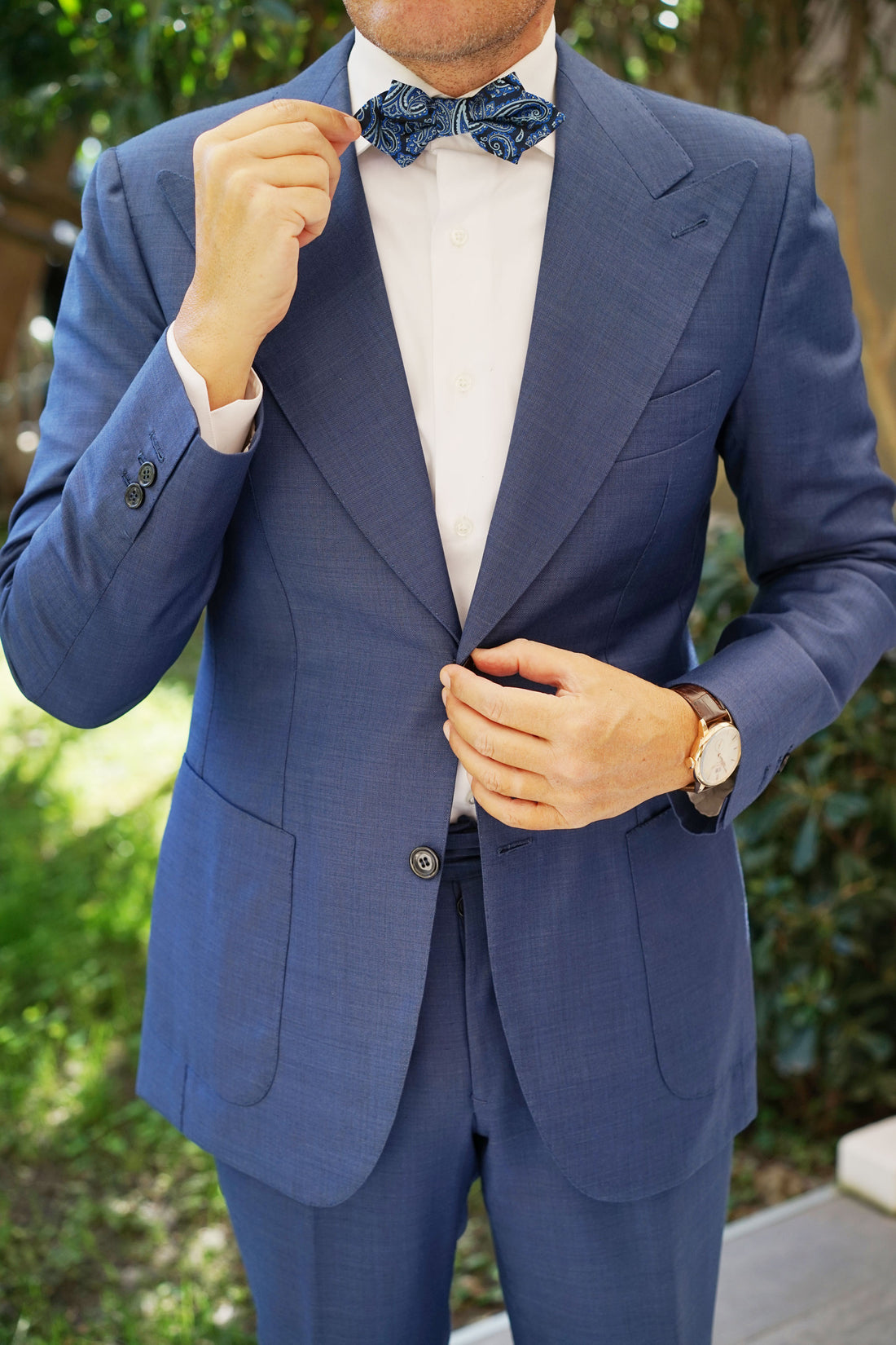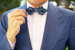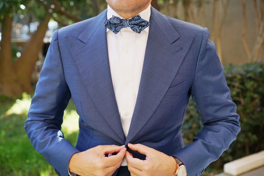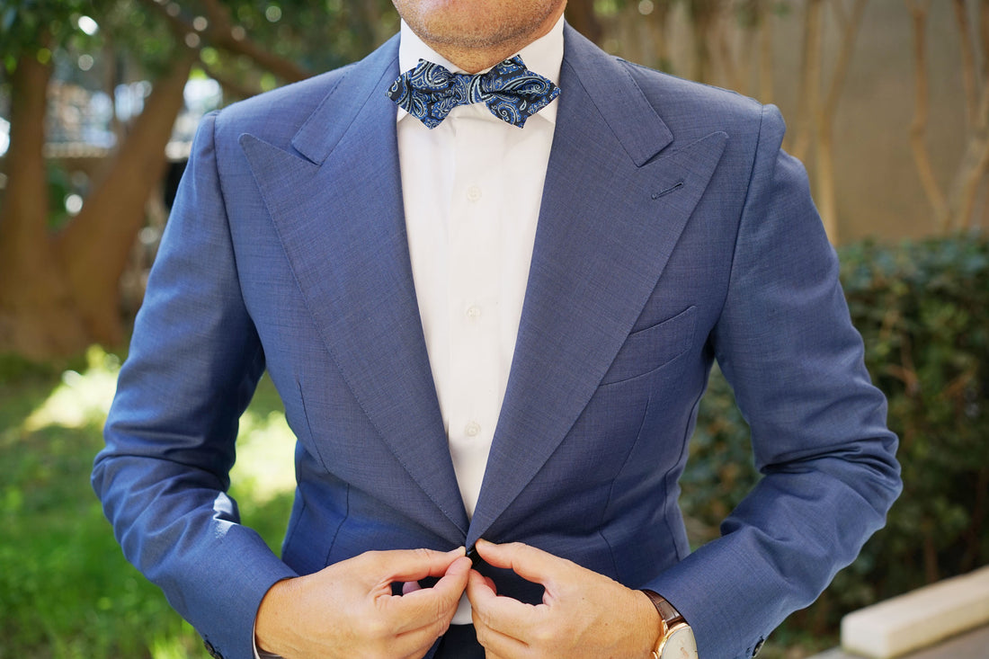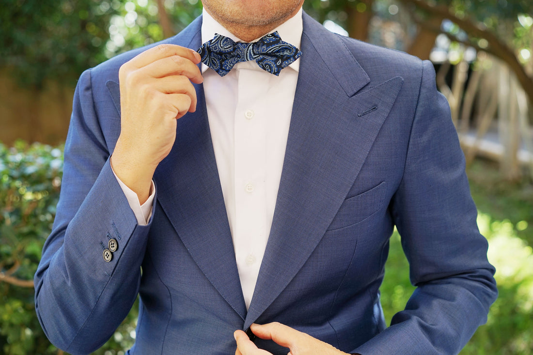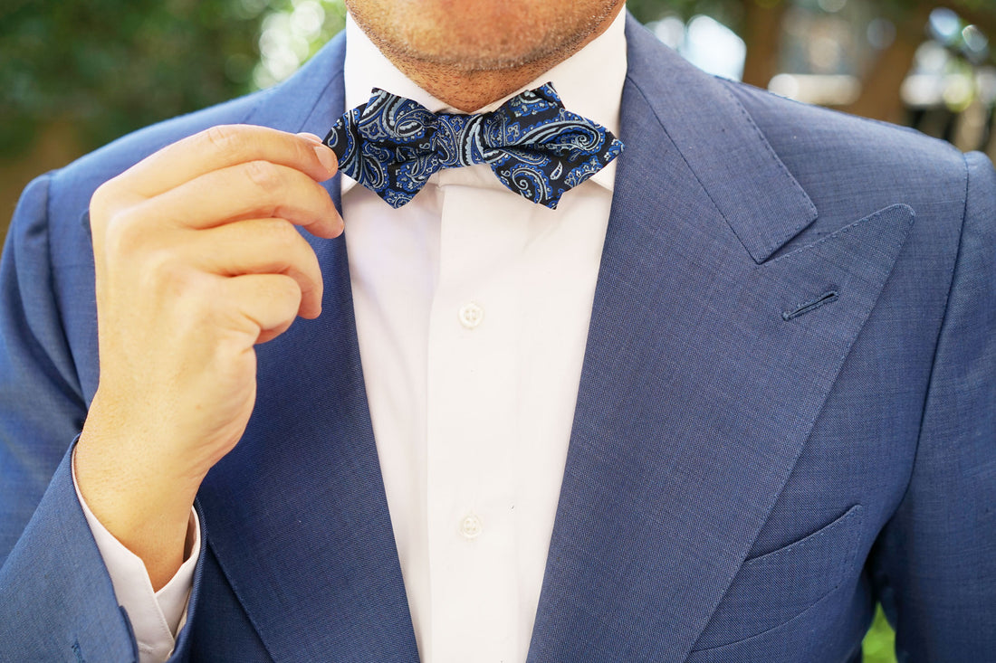 Hand-designed by the Brothers at OTAA, the Paisley Black and Blue Diamond Bow Tie is boastful of impeccable details. Let there be no mistake that this design is as intricate as they come, and with hand-stitching and meticulous tailoring to back it up; the Paisley Black and Blue Diamond Bow Tie is a fierce weapon. Incorporate it into your tailored repertoire to command attention at formal events and social engagements alike. Inspired by the designs that came out of the Persian Empire, this diamond bowtie is kitted out with a luxurious nautical flair to grant you confidence every time you step out the door. Designed exclusively by the brothers at OTAA.