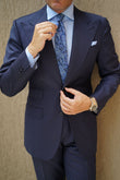 This blue skinny tie has navy floral patterns throughout and is best worn with a matching blue pocket square and suit to complete it.