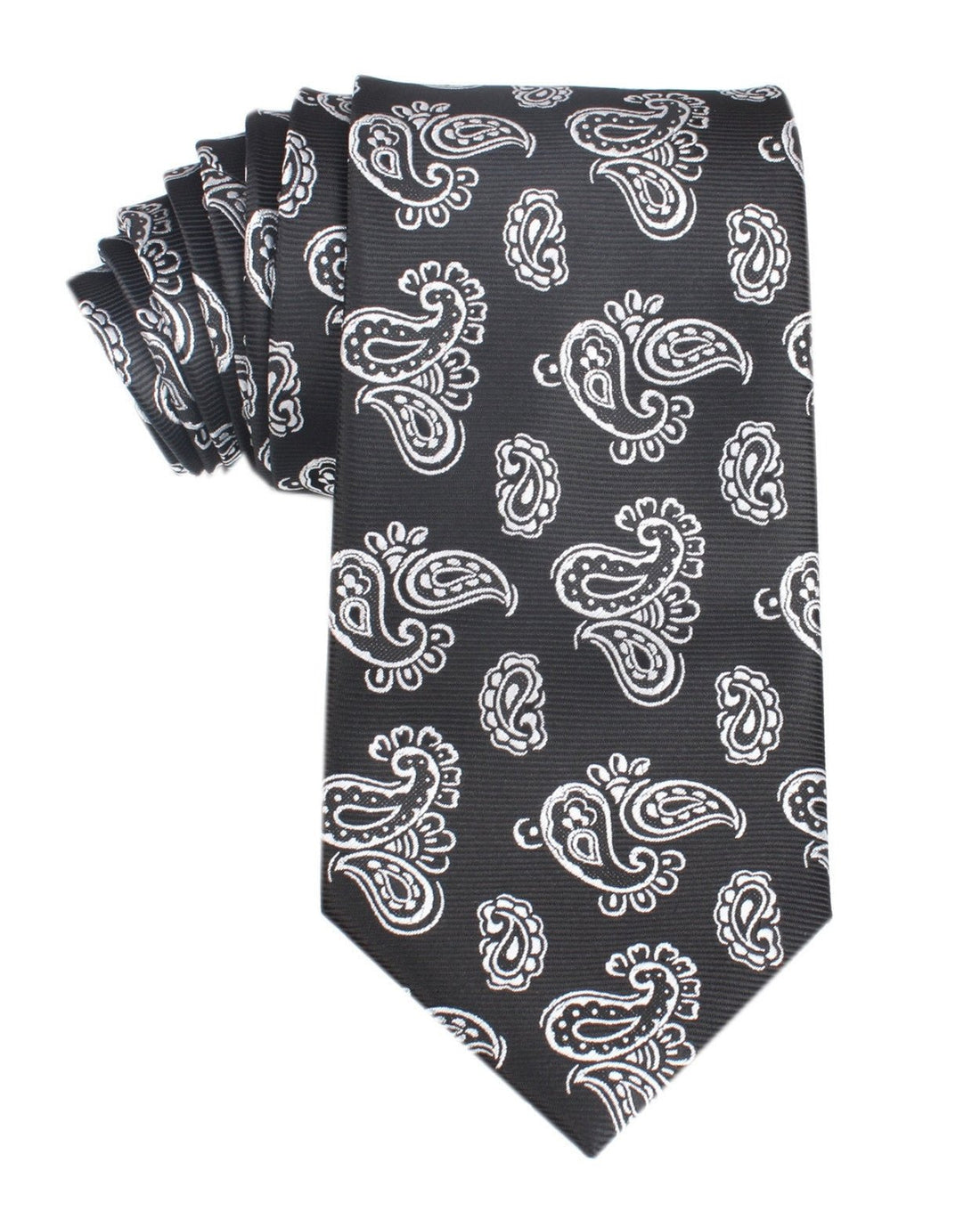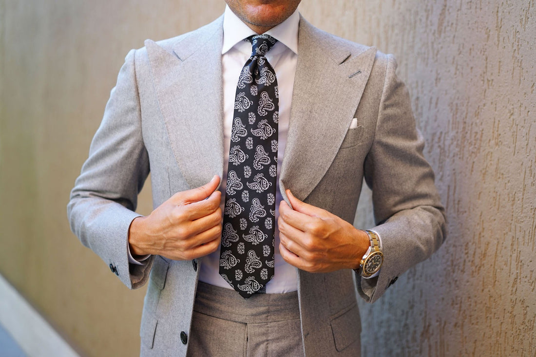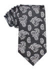 The Paisley Coal Black Necktie displays unique swirl patterns on a coal black fabric, suited for gentlemen who seek a conservative yet distinctive look.
