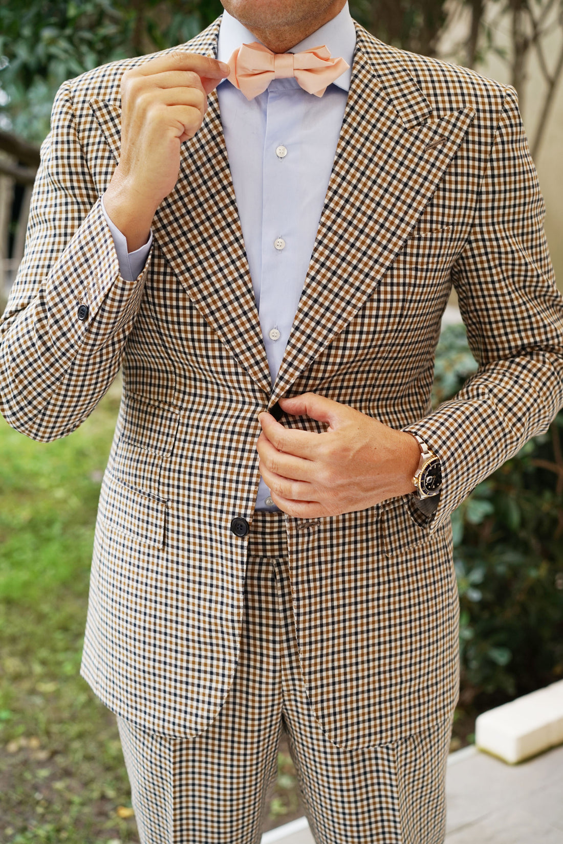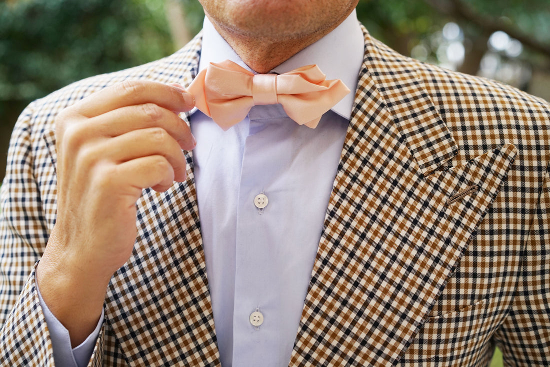 Gift your suits a flourishing perspective with the elegant details of OTAA's Peach Satin Diamond Bow Tie. Impeccably imbued with a delicate peach hue, this Peach Satin Diamond Bow Tie is an elegant statement that will form a flourishing centrepiece as part of your suit. Let the luxurious, sheen satin fabric incite an extra formal polish to get you scrubbed up to the nines. With top-notch quality and superb tailoring on its side; the Peach Satin Diamond Bow Tie has been stitched by hand and meticulously tailored for your utmost comfort. Wear it to make a lasting impression at weddings and other formal occasions. Designed exclusively by the Brothers at OTAA.