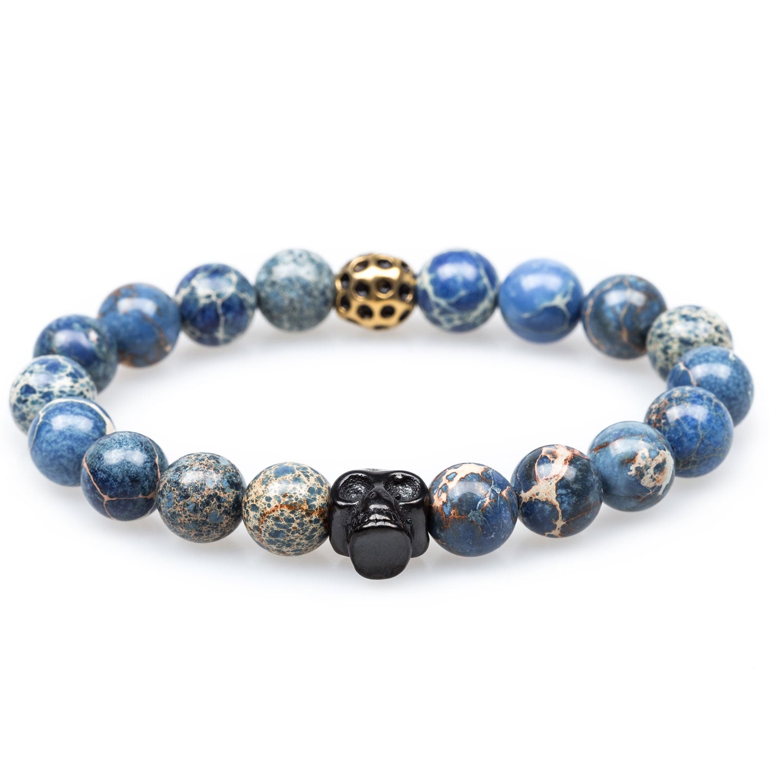 An exquisite addition to the OTAA selection, this Peyto Shattuckite Black Skull Bracelet is imbued with sentiments of refinement and sophistication. In 1922, the discovery of the virtually intact tomb of Tutankhamun became the best known and most spectacular archaeological find anywhere in the world. The small tomb contained hundreds of richly decorated objects that were needed to ascend the king to his afterlife. The exclusive shattuckite features of this design serve as a lavish tribute to the king's legacy. Shattuckite is a rare copper silicate mineral highly regarded for its vivid blue colour. It is named after the Shattuck Mine in Bisbee, Arizona, where this mineral was first discovered in 1915. The blue completion of shattuckite mineral is complimented by white and brown marbled details to invoke an intricate palette. This Peyto Shattuckite Black Skull Bracelet is adorned with an exquisite black skull and gold charm that were impeccably hand-chiselled from rhodium and finessed with intricate encryptions. Pair this men's bracelet with a suit jacket and necktie for formal events, or a smart shirt for casual wear.