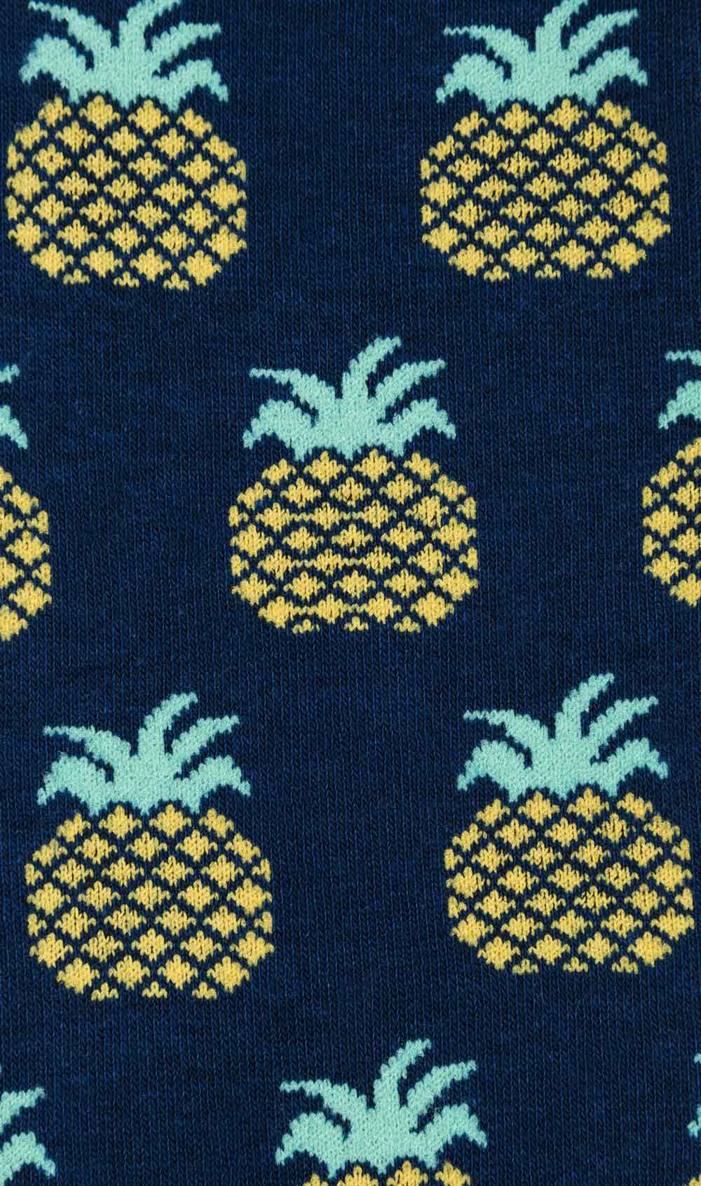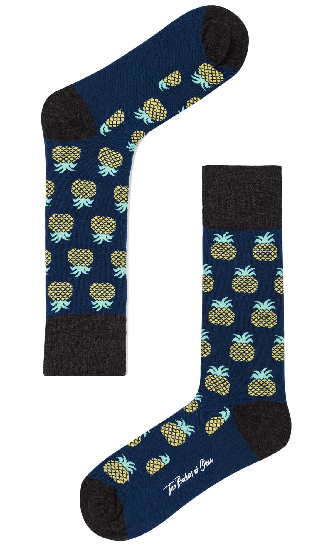 These Pineapple Socks are tessellated with yellow & green pineapples atop an elegant navy blue canvas. Heavenly crafted from a fine combed cotton material and finessed with a 200 needle stitch, you'll be stepping through the day with unmatched luxury and style. Designed exclusively by the Brothers at OTAA.