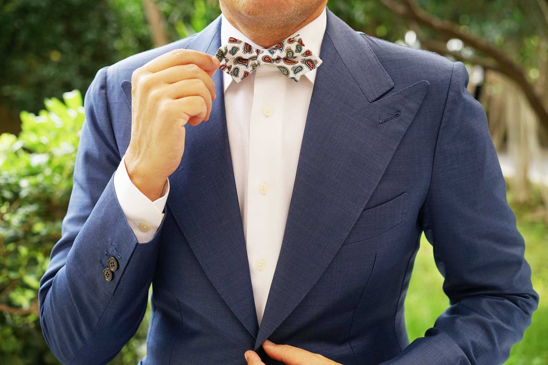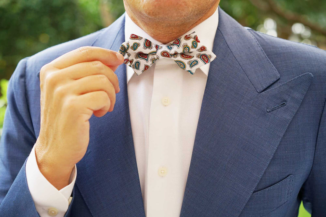 Make a sophisticated statement at your next event with OTAA's Ponte Vecchio White Paisley Diamond Bowtie. The white palette of the Ponte Vecchio White Paisley Diamond Pre-Tied Bowtie is met with ebullient turquoise, red and yellow paisley teardrop details for an artistic accent. OTAA’s hand-stitched approach to tailoring means this diamond bowtie is smooth to the touch and emanates a high-quality presence as part of formal ensembles. Providing an elegant way to finesse your formal tailoring, this vivacious Ponte Vecchio White Paisley Diamond Bowtie features a decadently smooth fabric and a sophisticated design.