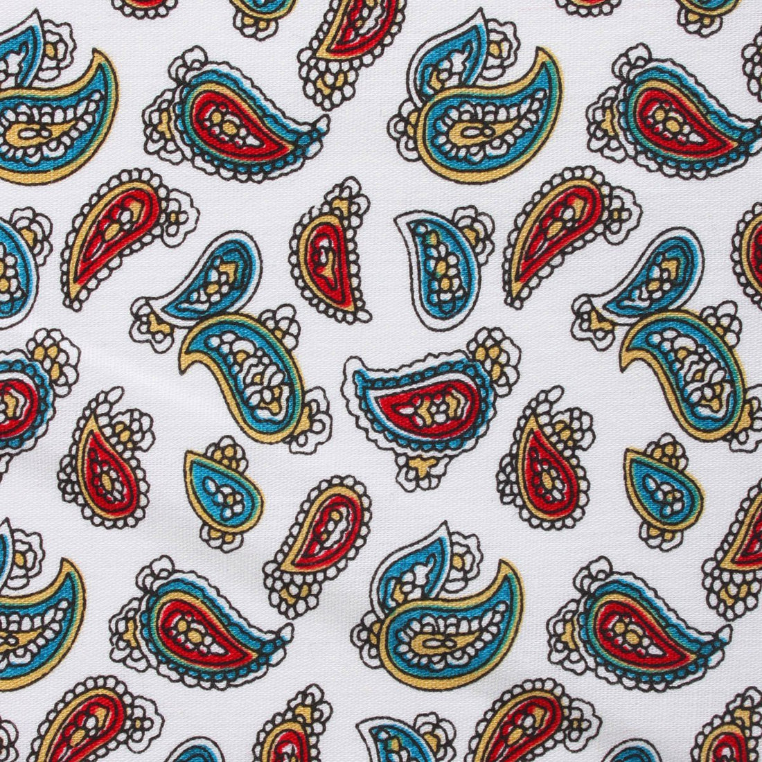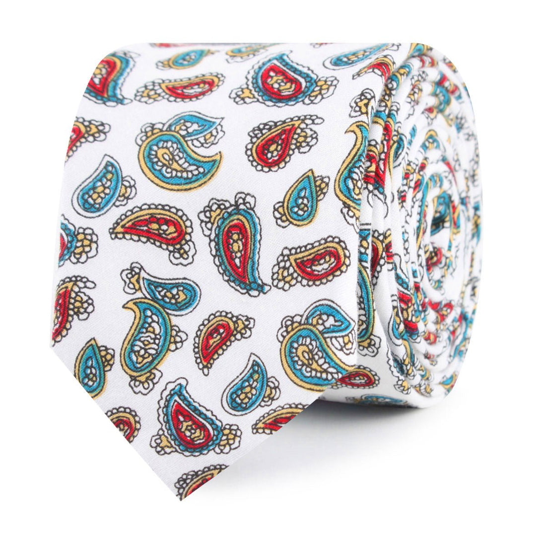 Make a sophisticated statement at your next event with OTAA's Ponte Vecchio White Paisley Skinny Tie. The white palette of the Ponte Vecchio White Paisley Thin Tie is met with ebullient turquoise, red and yellow paisley teardrop details for an artistic accent. OTAA’s hand-stitched approach to tailoring means this skinny tie is smooth to the touch and emanates a high-quality presence as part of formal ensembles. Providing an elegant way to finesse your formal tailoring, this vivacious Ponte Vecchio White Paisley Skinny Tie features a decadently smooth fabric and a sophisticated design.