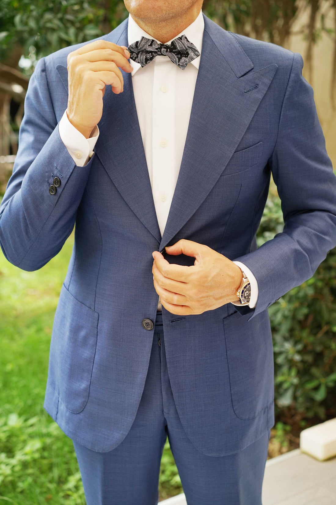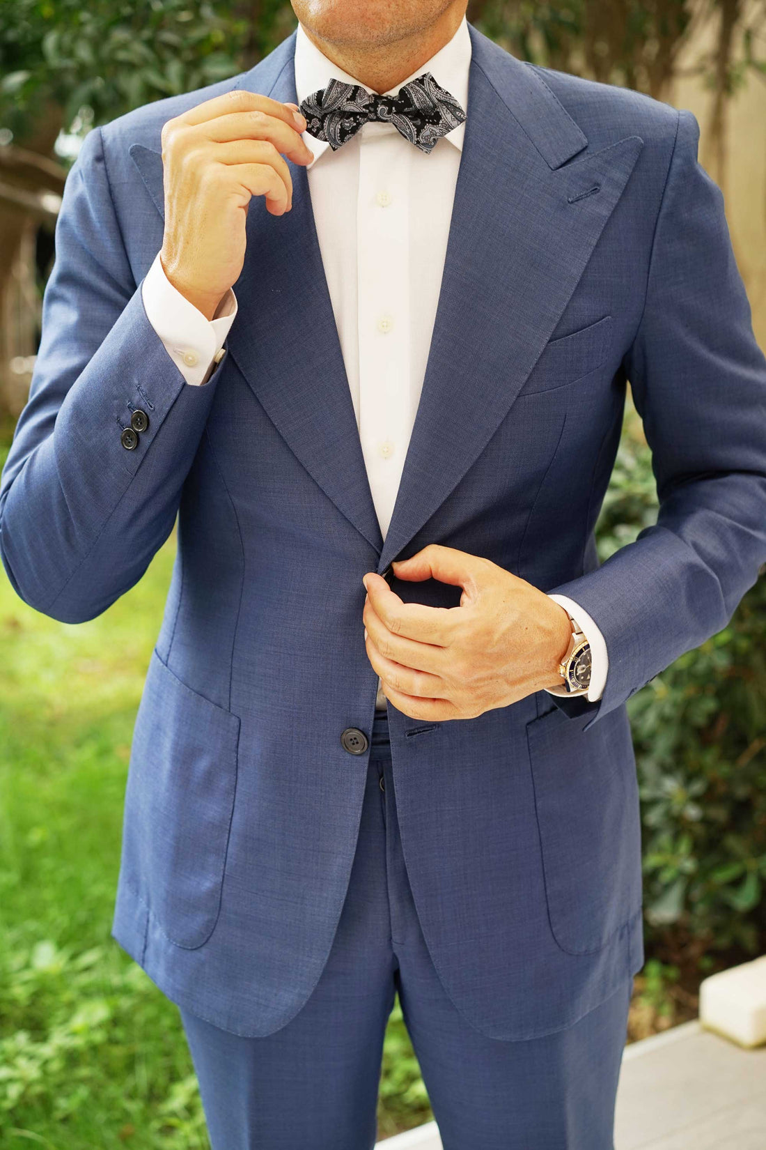 OTAA’s hand-stitched approach to tailoring means this diamond bowtie is smooth to the touch and emanates a high-quality presence as part of formal ensembles. The indulgent black complexion is met with cool-toned grey and purple hues in an intricate paisley pattern. Designed exclusively by the Brothers at OTAA, this handsome diamond bowtie offers an accomplished accent to your formal tailoring.