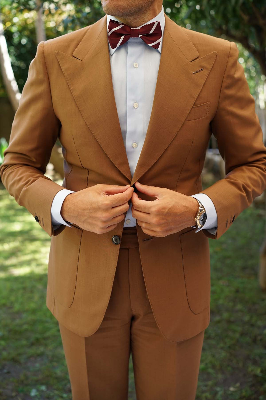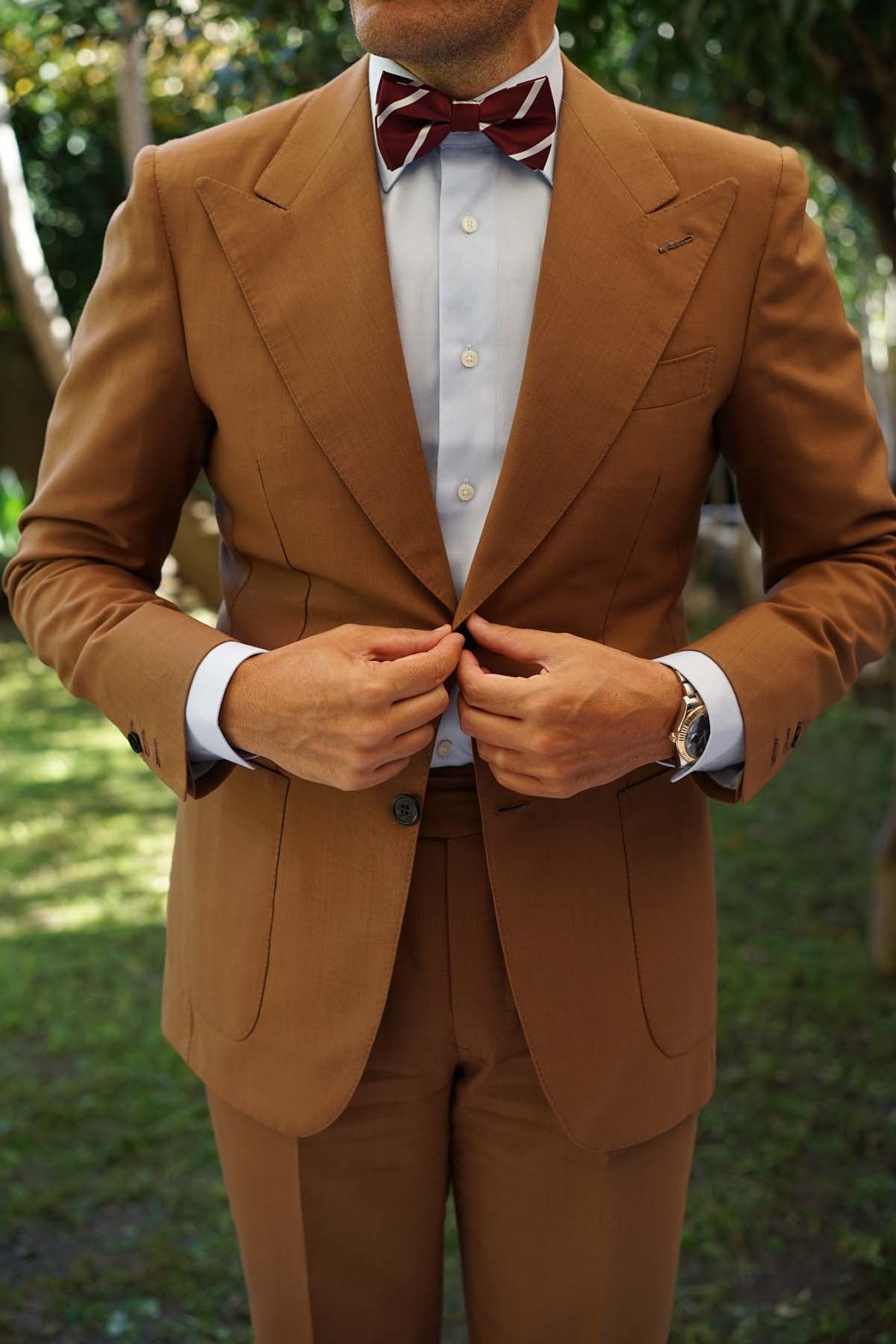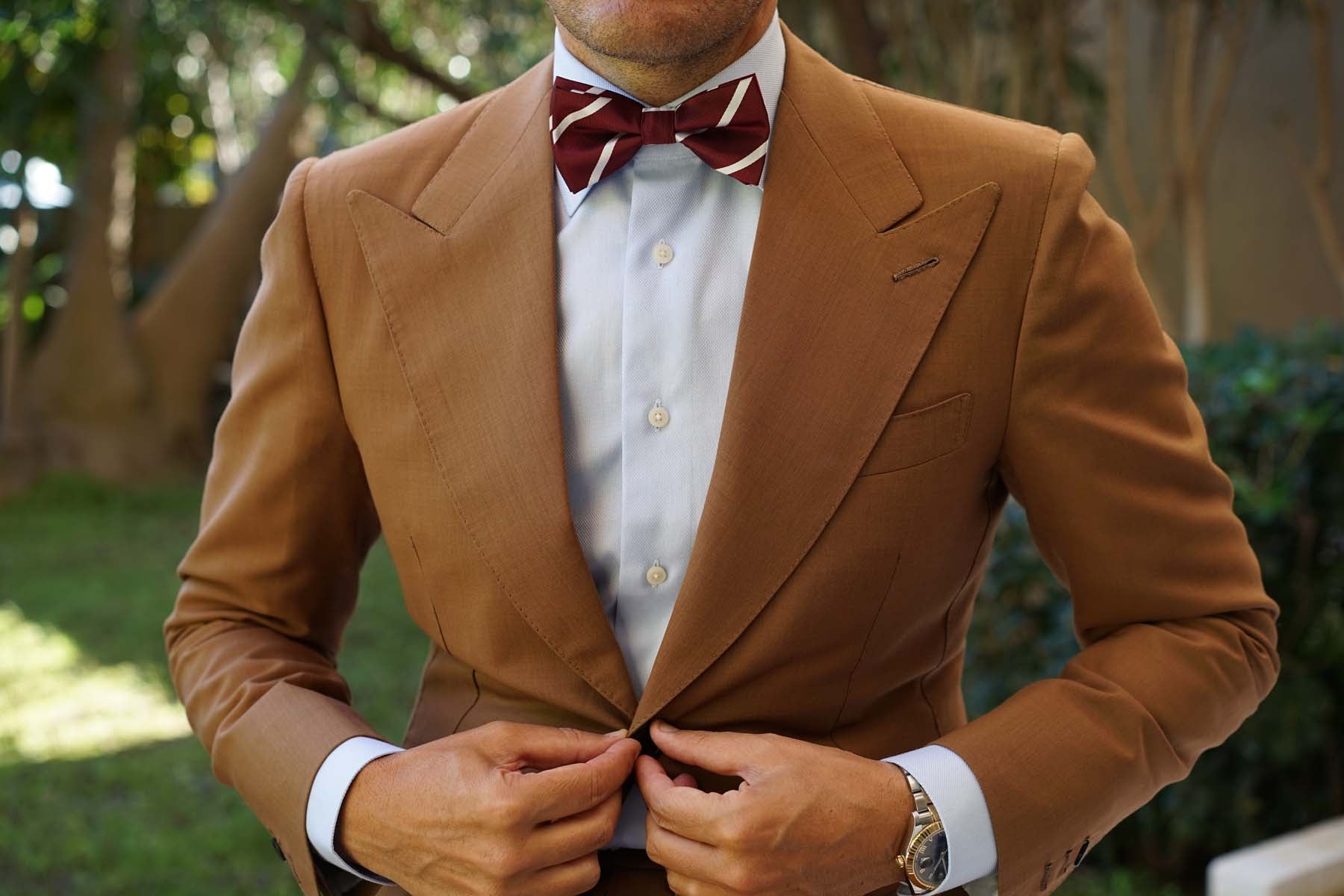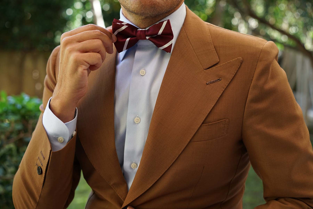Add an elegant tone to your tailoring with OTAA’s Royal Burgundy Striped Bow Tie. Superbly finessed with intricate textures, this pre-tied bowtie showcases the label’s high-quality philosophy. The luxurious burgundy palette involves rich red hues that are superbly complemented by white striped accents for an artistic outlook. Crafted by hand and tailored to perfection, this Royal Burgundy Striped Bow Tie brings a high-quality aspect to your evening looks. Designed exclusively by the Brothers at OTAA.