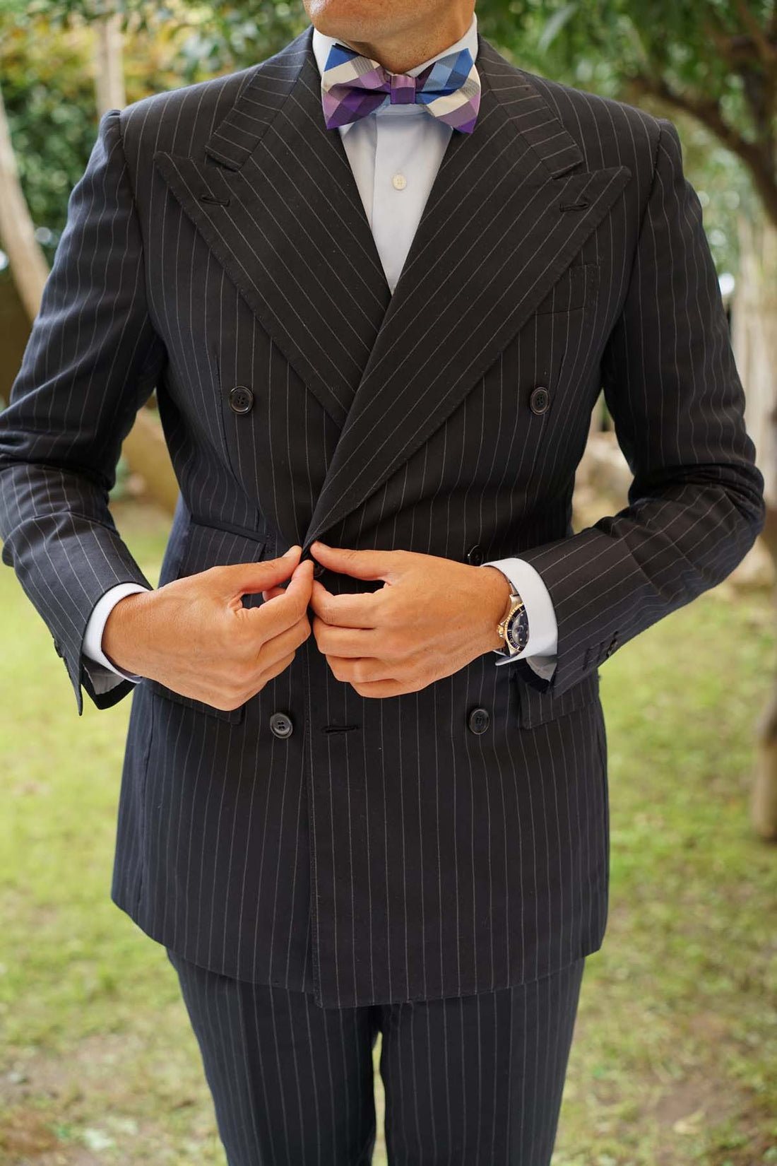 The men’s checkered royal purple, white and blue thin pre-tied bow tie suits all occasions from formal to casual.