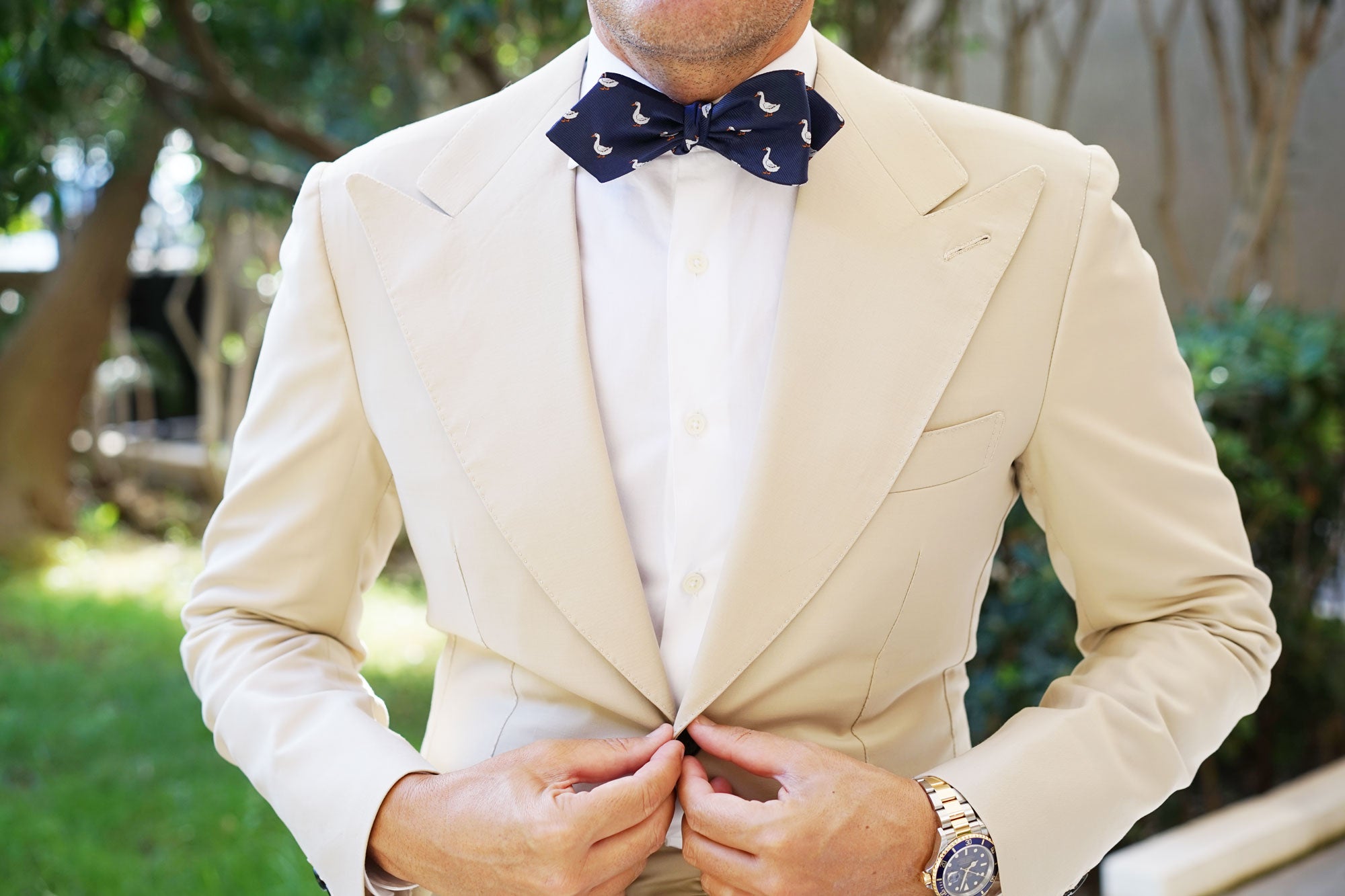 Our hand-sewn approach allows the Russian White Goose Diamond Self-Tie Bow to capture extraordinary detail as there is little machinery used in the crafting of this tie. Touches such as these make all the difference. This Russian White Goose Diamond Bow Ties Self-Tie exudes sophistication and is hand cut and sewn on a classic navy backing. Designed exclusively by The Brothers at OTAA.