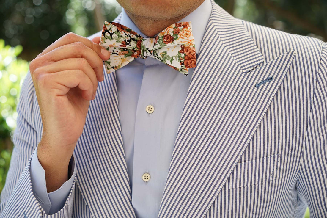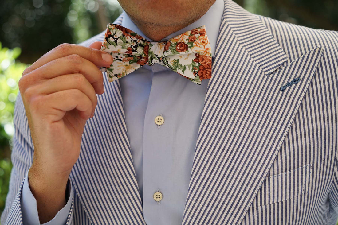 Imbued with an artisanal burnt orange and black palette, this superb untied bow tie features light orange, green and white highlights in a floral design. The hand-stitched features and elegantly tailored body makes this self tie bow tie a stand-out option for formal wear. Designed exclusively by the Brothers at OTAA, this San Pietro Orange Floral Self Tie Bow Tie is recommended by Mr Bond himself (the Italian consultant).