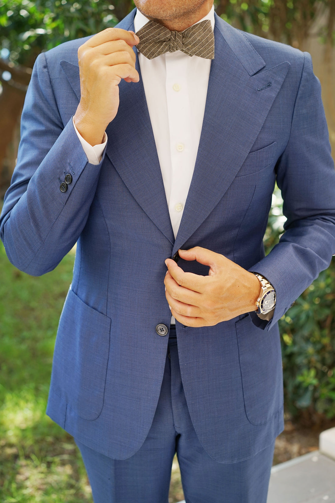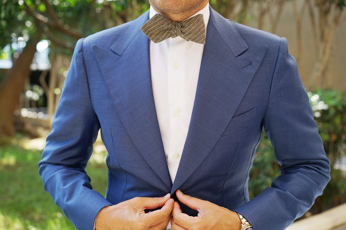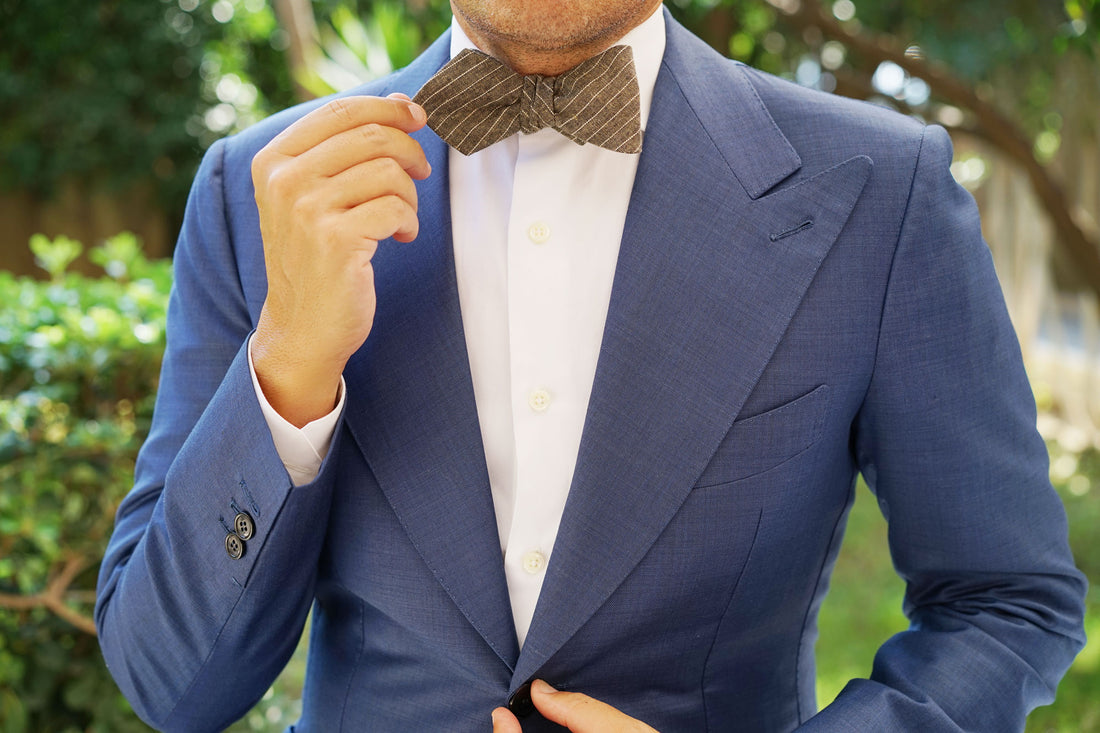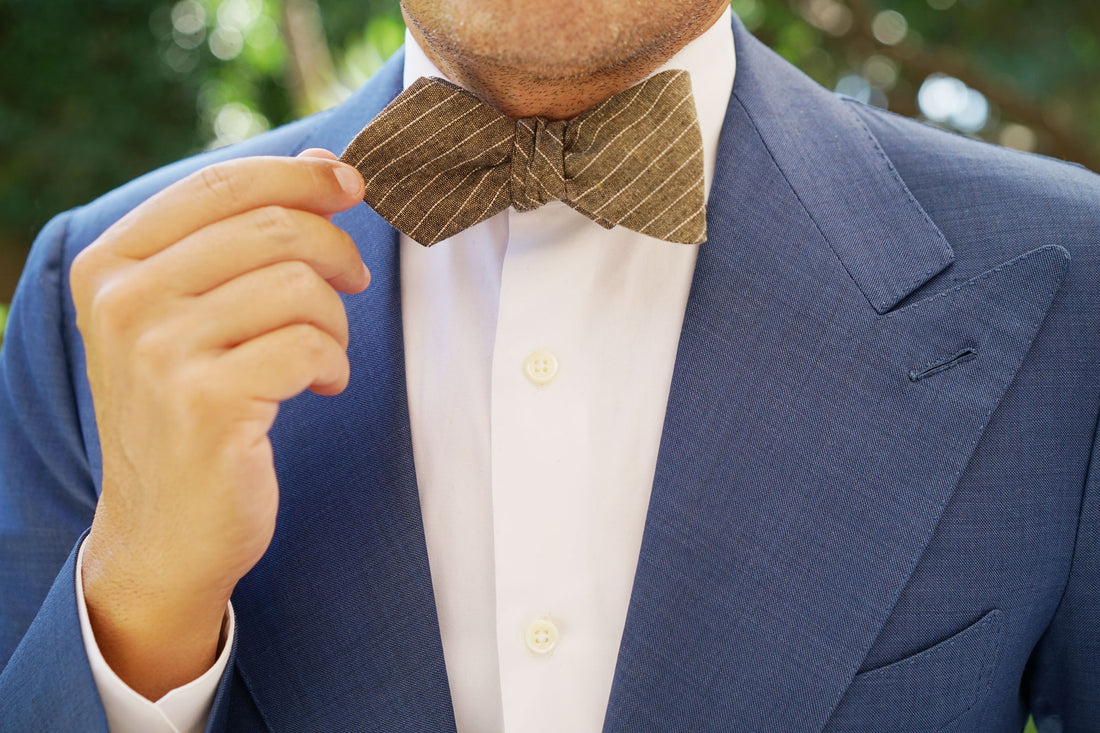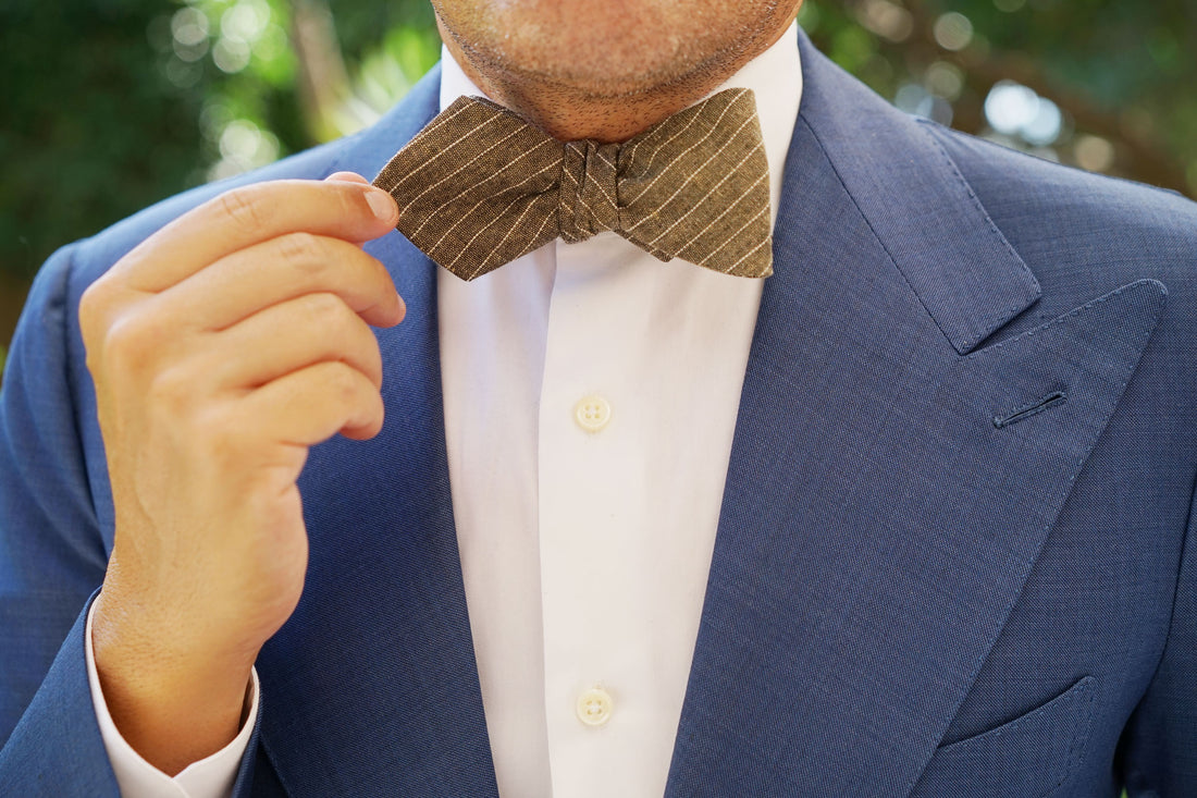 From OTAA's specialty line, this elegantly constructed Sandman Linen Pinstripe Diamond Self-Tie Bow Tie makes a fresh addition to your tailored wardrobe. Handcrafted with immaculately stitched details, this exclusive design combines sleek style with uncompromising quality. At OTAA, we firmly believe that every distinguished gentleman should be in possession of at least one pinstripe bow tie; and this Sandman Linen Pinstripe Diamond Untied Bowtie makes a flawless choice. Its ease of pairing with dress shirts and suits has made this design a timeless favourite and a must-have staple for business attire. This handsome design is imbued with refined brown hues and a white diagonal pinstripe pattern to emanate a sophisticated look. Designed exclusively by the Brothers at OTAA.