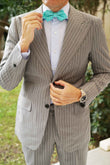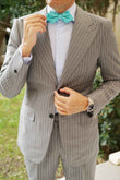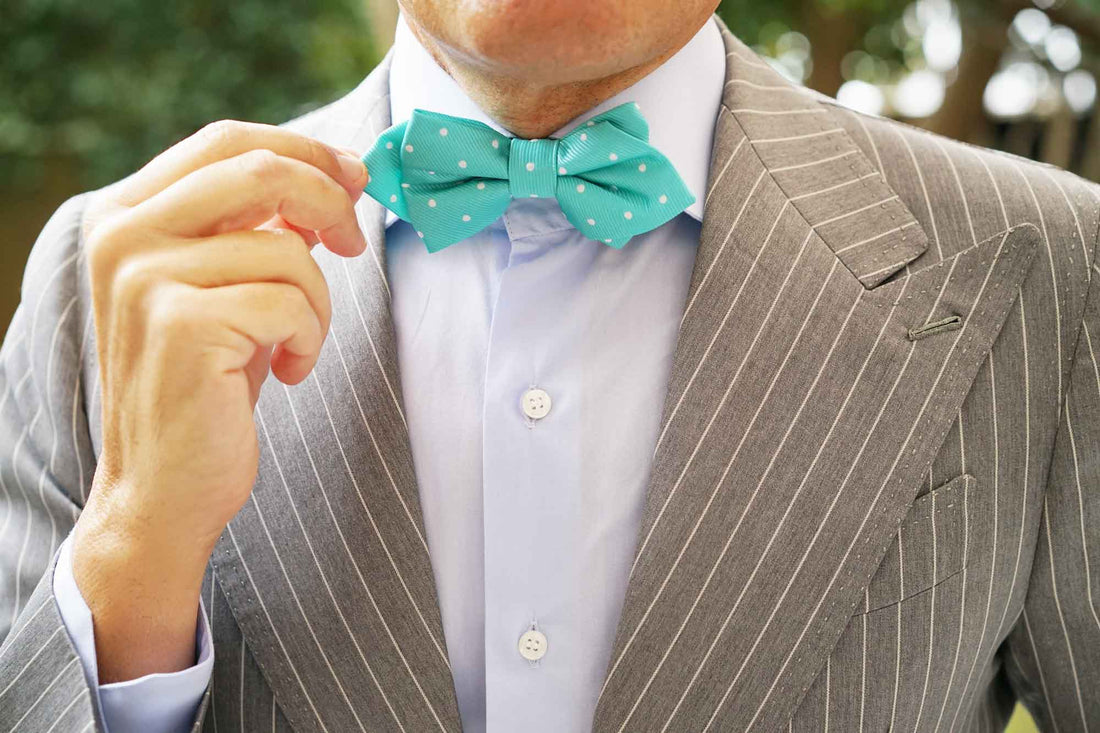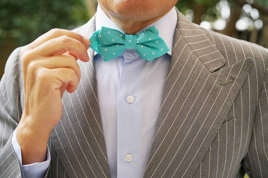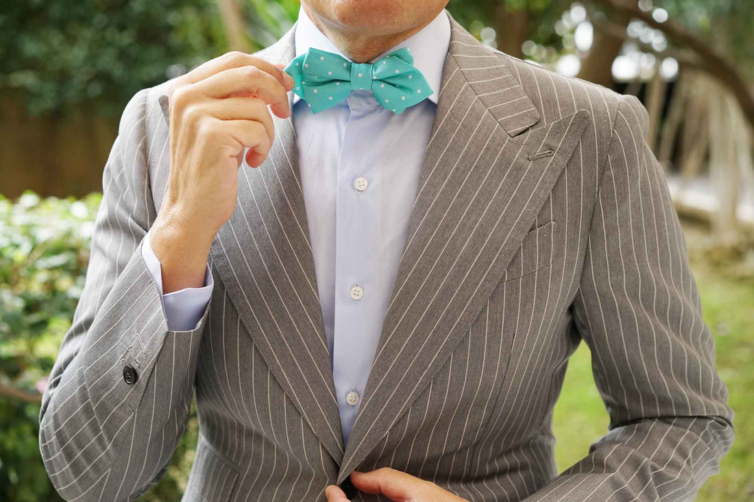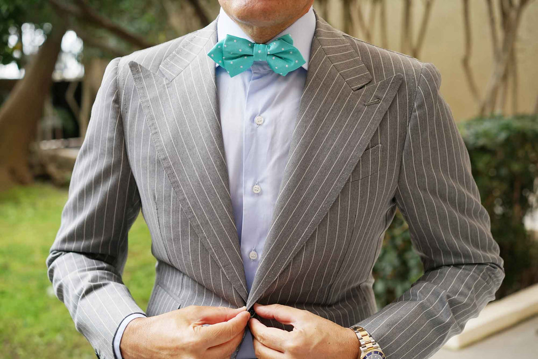 Get suited for seaside style with OTAA's Seafoam Green with White Polka Dots Diamond Bow Tie. Richly finessed with a vibrant blue fabric, this diamond bowtie is sure to make a memorable statement. The Brothers at OTAA have worked long and hard to ensure this Seafoam Green with White Polka Dots Diamond Bow Tie is packed full of small details that will make a big difference. With hand-embroidered white polka dots and an intricate lined fabric, this diamond bow tie is brimming with textures to enhance the luxury of your suits. Let its precise tailoring and hand-stitching make all the difference when it comes to dressing for sophistication. Designed exclusively by the Brothers at OTAA.