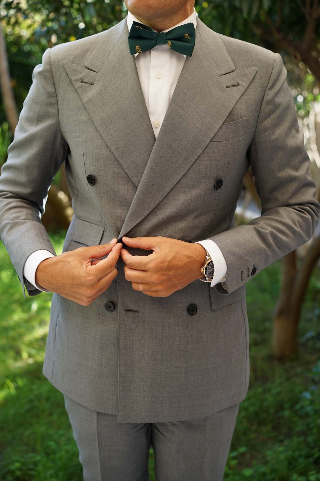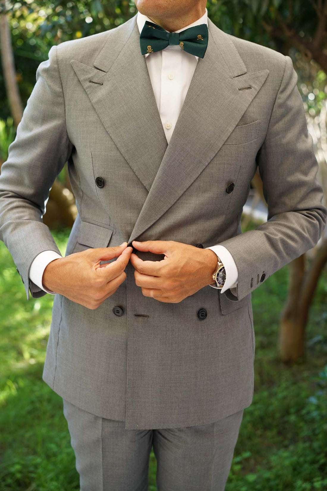 The Brothers at OTAA prize craftsmanship, which is why this Skull & Crossbones Green Bow Tie is constructed by hand from an exceptional green, satin cloth. It is also inspired by Jolly Roger, the misunderstood pirate who wanted nothing more than to rake in gold. The nail head-micro is understated yet classy due to the subtly nuanced appearance of the flat weave. Team it with a plain shirt and polished Oxford shoes to emanate refinement. Designed exclusively by The Brothers at OTAA.