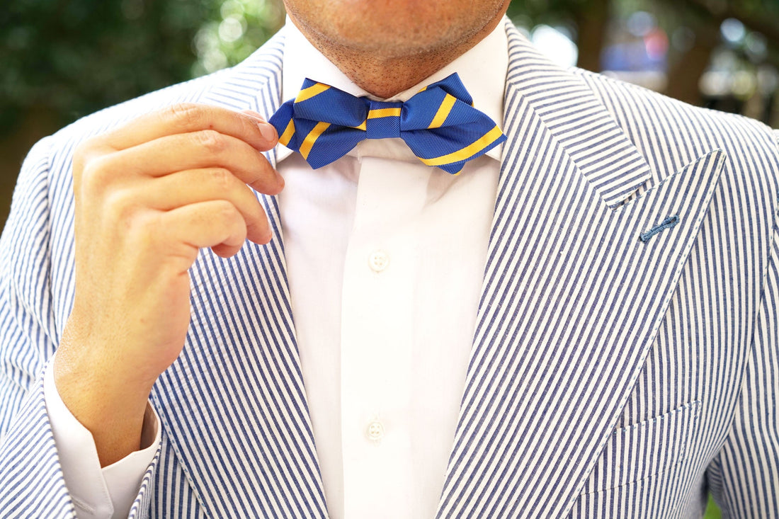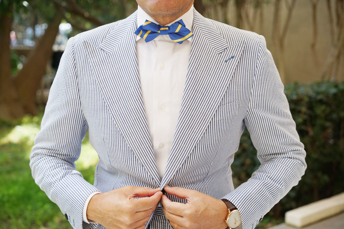 Suit up to elegant proportions with OTAA's Sky Blue with Yellow Stripe Diamond Bow Tie. A signature piece from the label's first collection, the Sky Blue with Yellow Stripe Diamond Bow Tie is a timeless statement for men who wish to achieve panache. The refreshing accents of sky blue and yellow will work to gift your suits a colourful centrepiece, and with a soft fabric that's been tailored by hand; this diamond bowtie is equally matched in exceptional style and quality. This bowtie features a diagonal line backing that will give your wardrobe an elevated point of texture. Designed exclusively by the Brothers at OTAA.