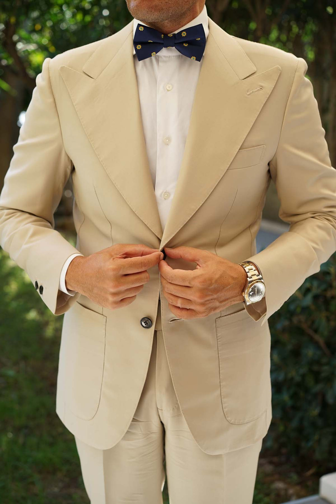 This elegant Sunflower Bow Tie offers charming floral details atop a sophisticated navy blue fabric. Constructed by hand and cut from a plush, satin cloth, this pre-tied bowtie effortlessly marries floral style with superior quality. Let the flourishing yellow and blue accents give a vivacious accent to your everyday ensembles. Designed exclusively by the Brothers at OTAA.