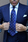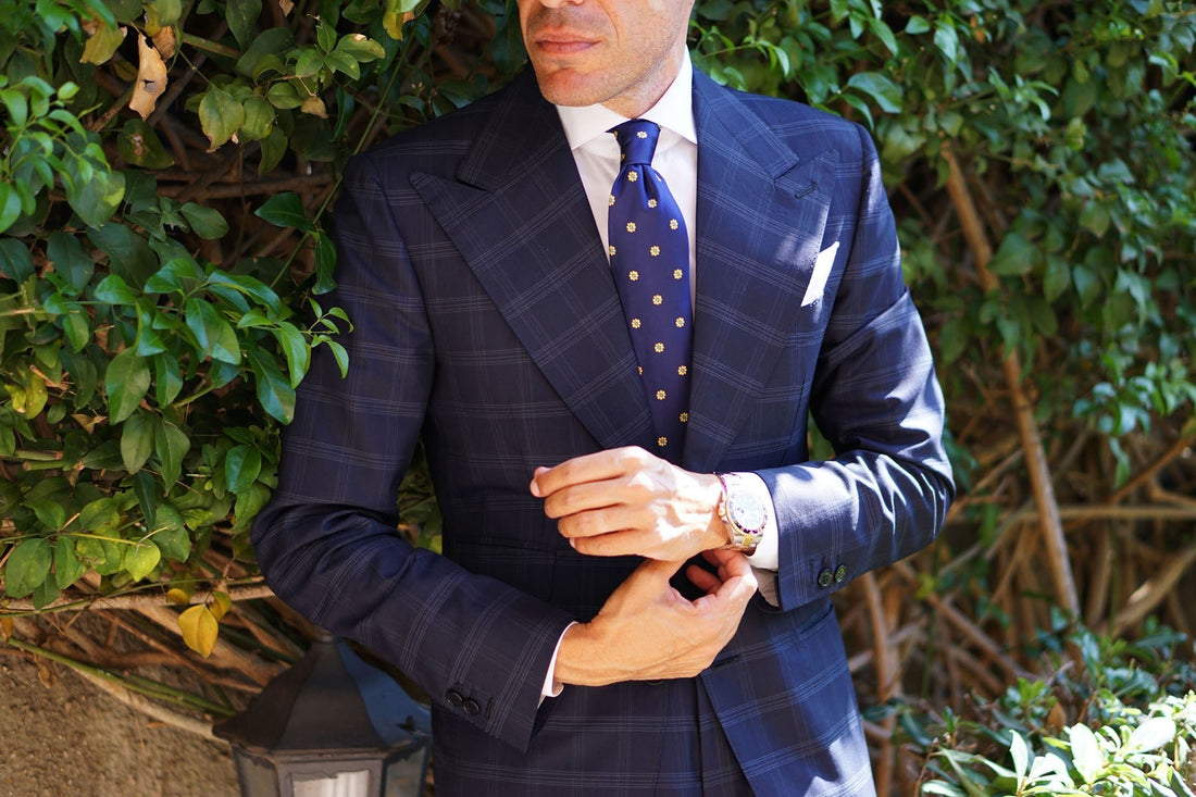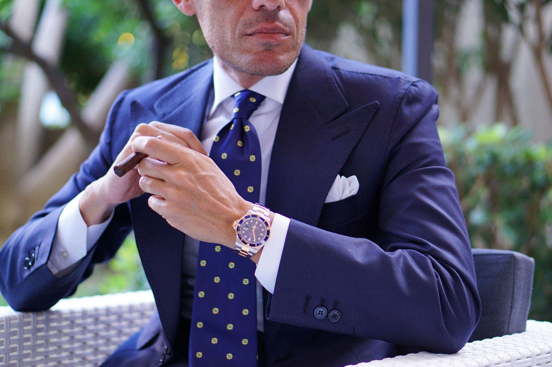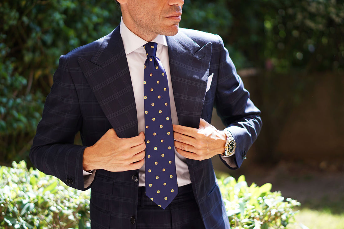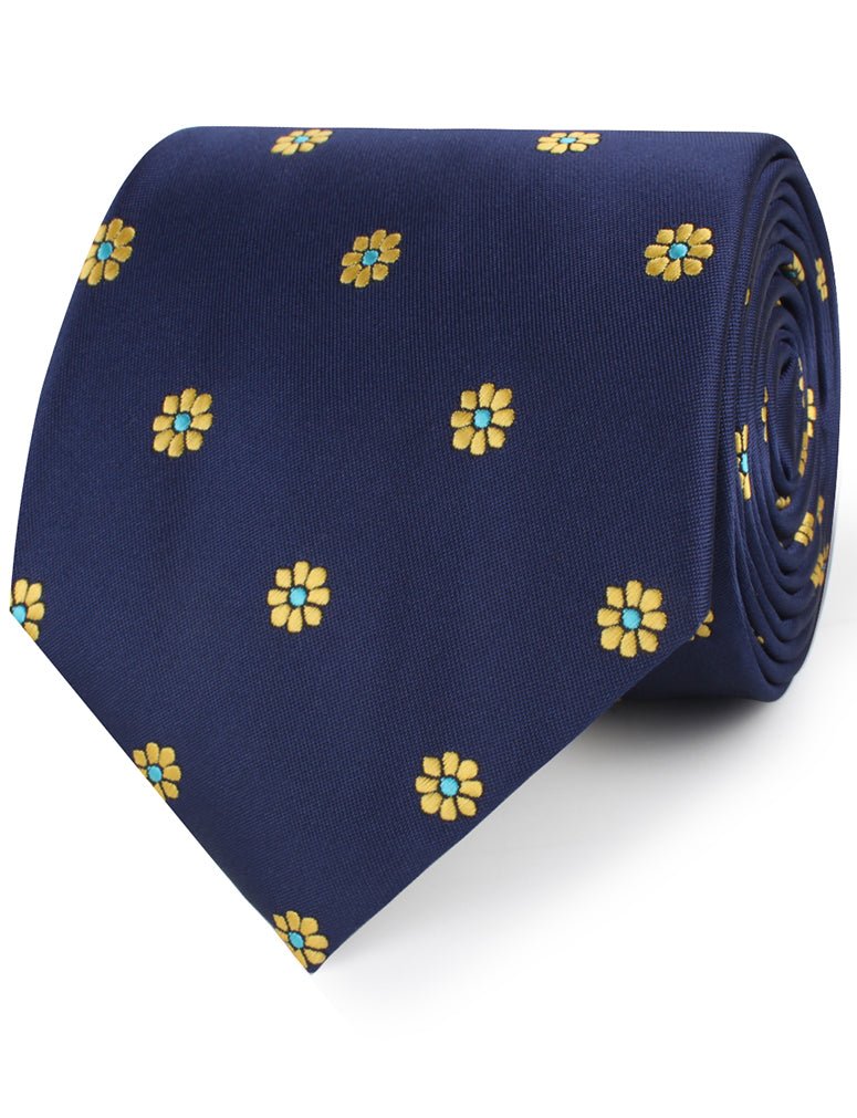 This elegant Sunflower Tie offers charming floral details atop a sophisticated navy blue fabric. Constructed by hand and cut from a plush, satin cloth, this necktie effortlessly marries floral style with superior quality. Let the flourishing yellow and blue accents give a vivacious accent to your everyday ensembles. Designed exclusively by the Brothers at OTAA.