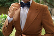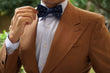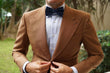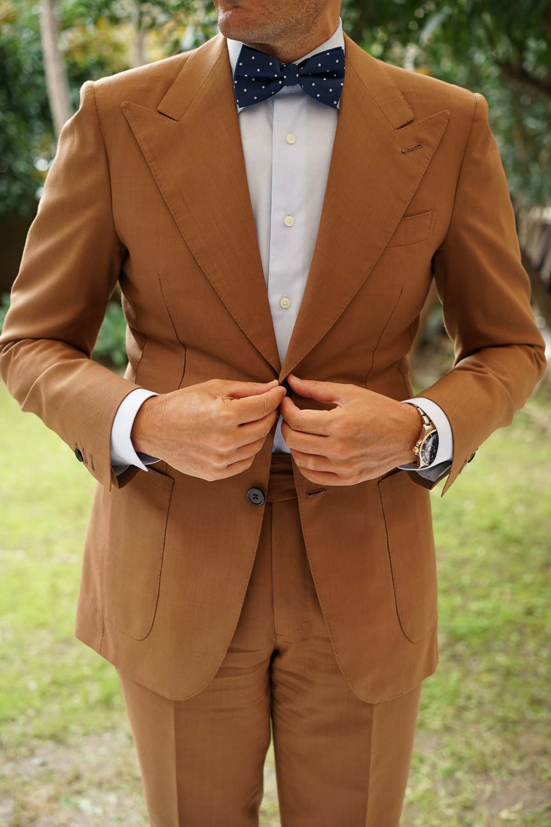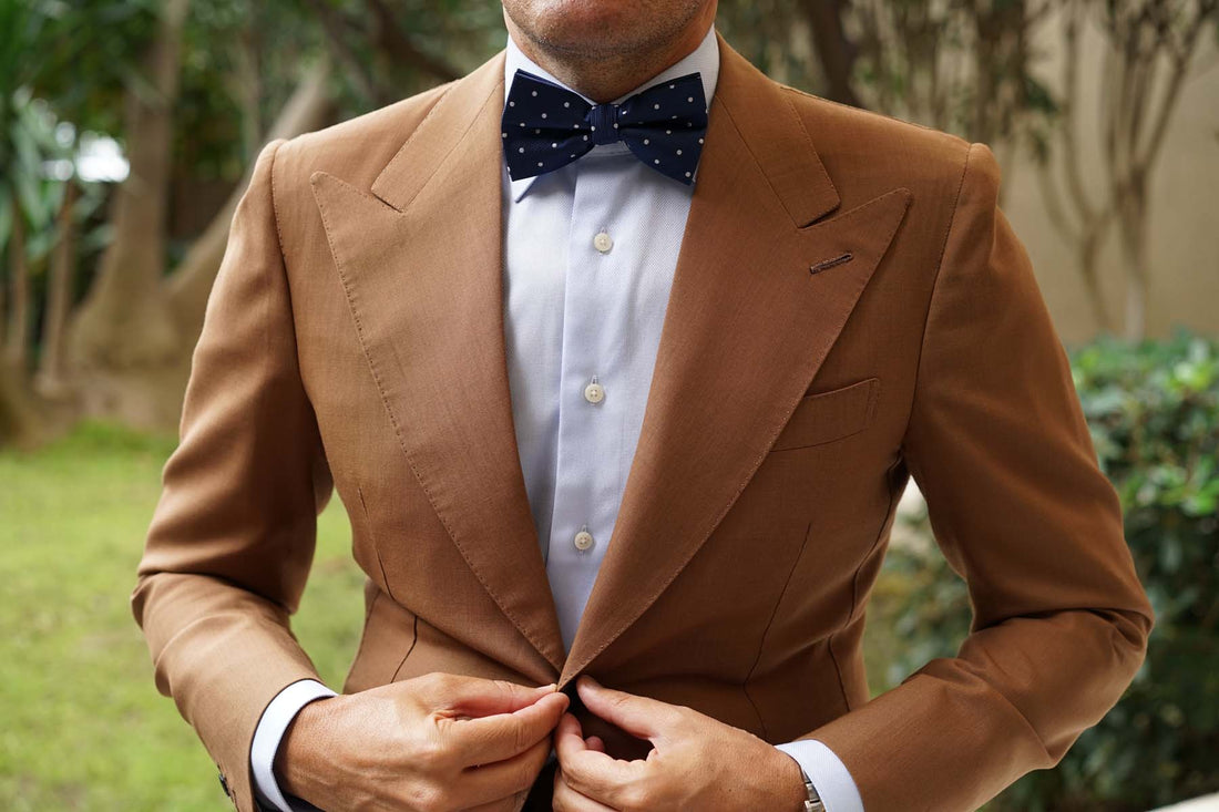 The OTAA Navy Blue with White Polka Dots Bow Tie features a myriad of inspirations. The bold navy and polka dot intarsia references the brand's most popular signature colour, while the layered-navy stripe background is a motif that nods to traditional Melbournian wear. This handsome Navy Blue with White Polka Dots Bow Tie is handcrafted.