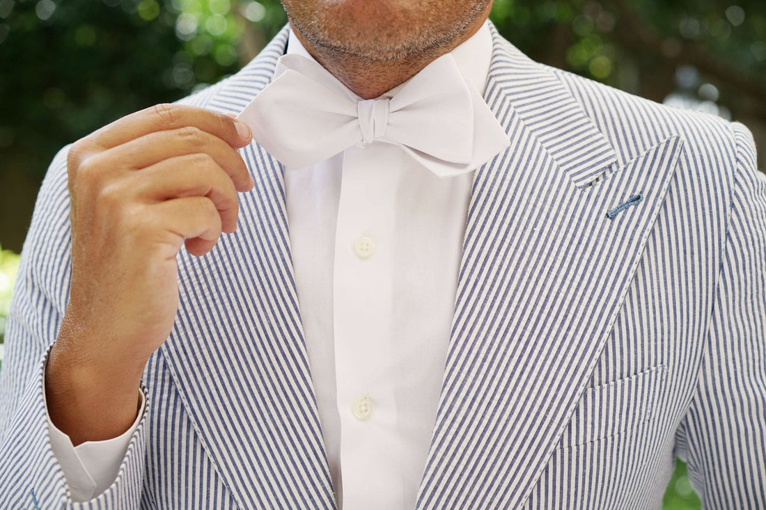 Suit up to perfection with the beautiful solid White Cotton Self-Tied Diamond Tip Bow Tie. This cotton stark White Self-Tied Diamond Tip Bow Tie features a refined matte finish, giving just the right amount of sheen that's perfect for formal events, important business meetings or weddings. This durable tie is never short on style and you'll be receiving compliments for years to come.