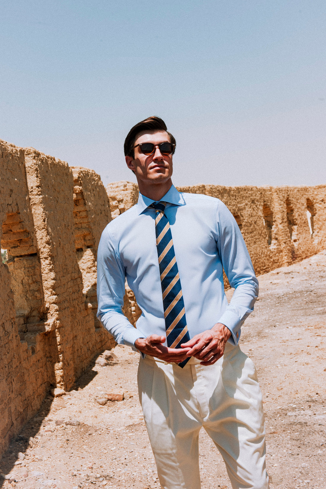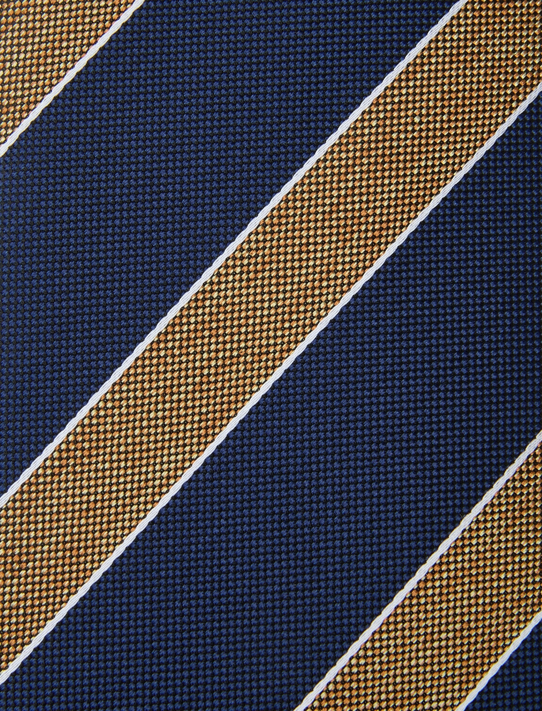 With a nod to naval prestige, The Trafalgar Commodore Navy & Gold Tie pairs a deep navy base with commanding golden stripes. The result is a tie that exudes strength, luxury, and classic charm. The fabric's silky texture adds a layer of refinement, while its construction ensures a flattering knot every time.