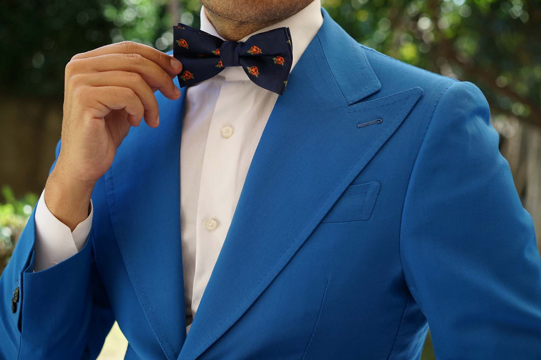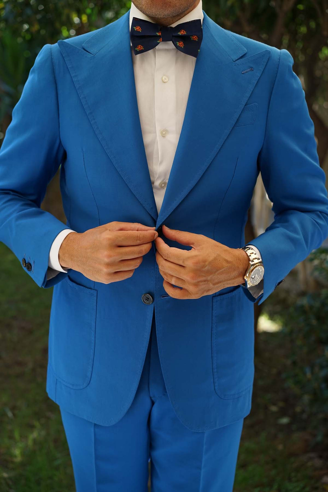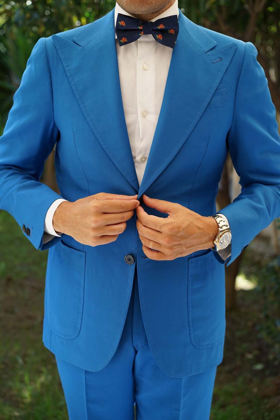 Orange and green turtles (slowly) crawl along a sumptuous navy blue canvas. Handcrafted from a fine, navy fabric and tailored to perfection, this Tropical Turtle Bow Tie showcases an unsurpassed level of quality. Subtly textured with diagonal lines, this pre-tied bowtie makes the perfect staple for your boardroom styles. Designed exclusively by the Brothers at OTAA.