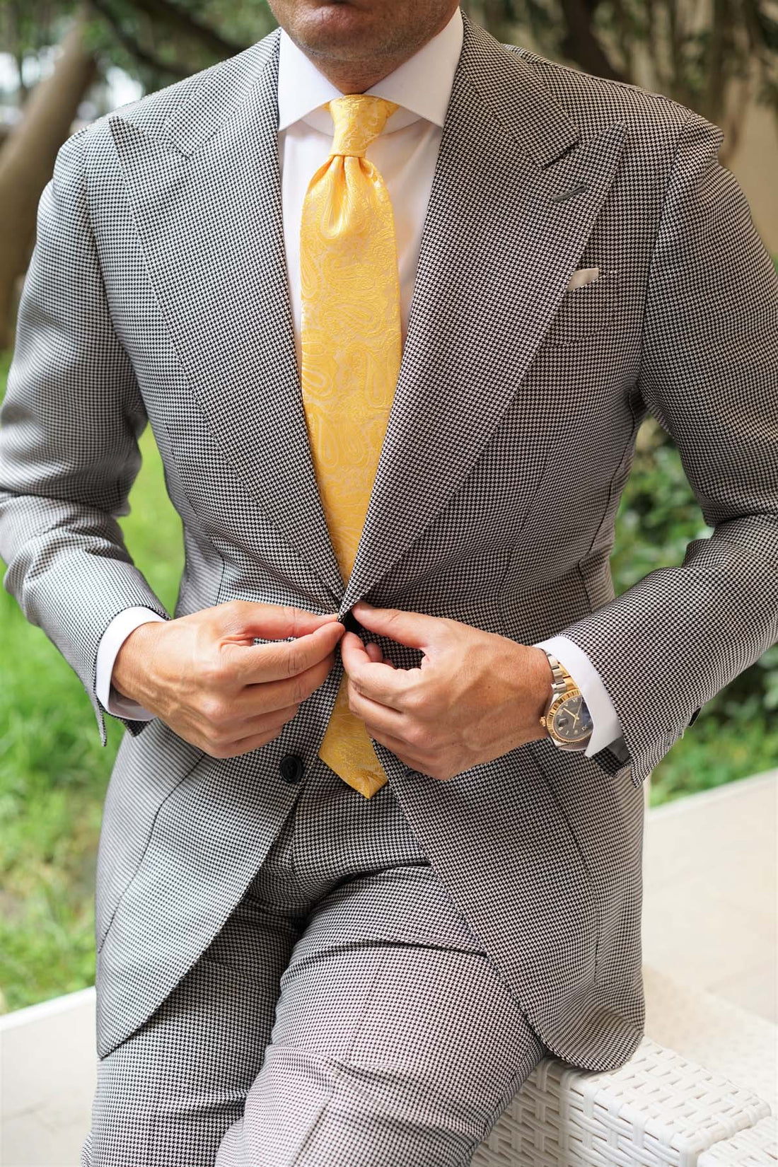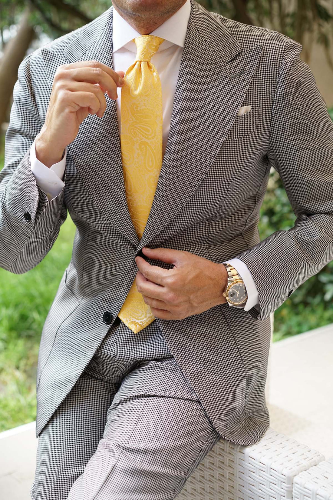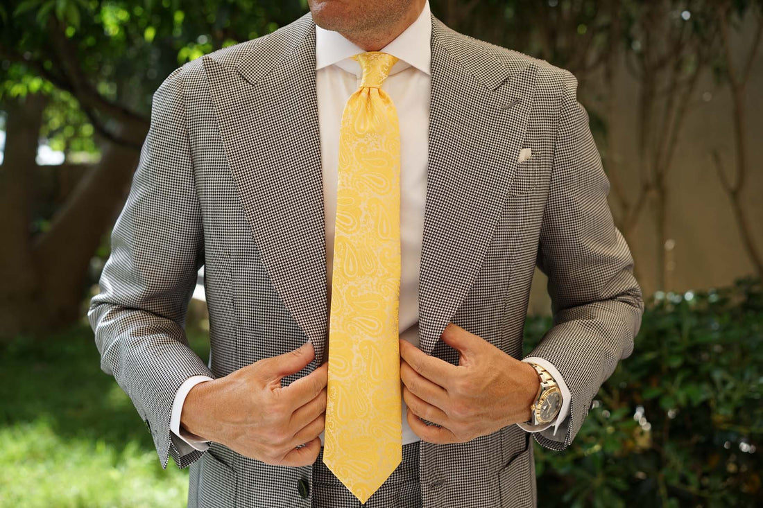 The rich golden lustre of the paisley etched pattern reflects the warm beauty of a European summer’s day with the same elegance as a glass of expensive whisky, hoisted in a toast at the successful business merger you just orchestrated while wearing this gem. Come, feel the warm embrace of the Tuscan Sun Yellow Paisley Tie.