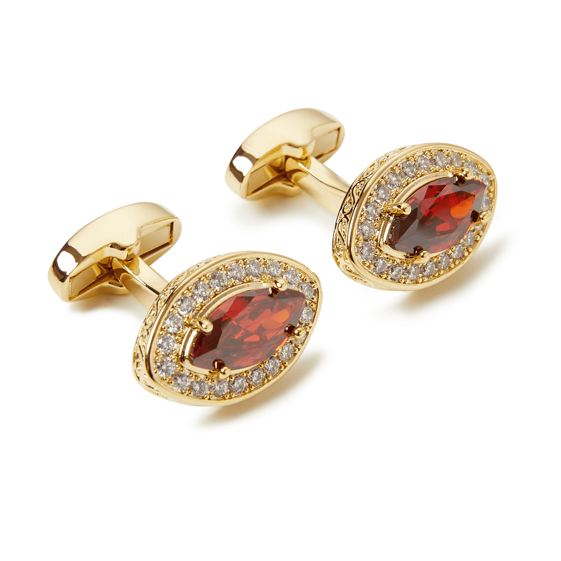 Introducing the Valencia Garnet Marquis Cufflinks, a true embodiment of elegance and warmth. These cufflinks feature a stunning marquise-cut gem at the center, surrounded by a halo of sparkling crystals, all set within a luxurious gold-plated frame. The rich, fiery red of the garnet contrasts beautifully with the radiant gold, creating a look that is both bold and sophisticated, perfect for making a lasting impression at any formal event.
