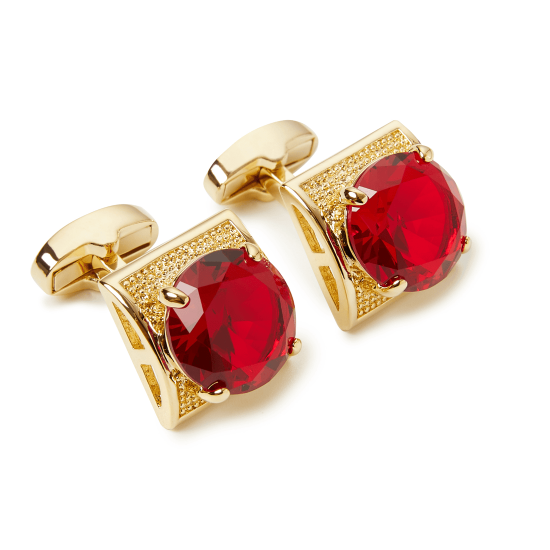 Introducing the Vienna Crimson Gold Cufflinks, a striking combination of elegance and bold design. These cufflinks feature a deep crimson gem set in a lustrous gold-plated frame, creating a captivating contrast that demands attention. The brilliant red stone exudes passion and luxury, making these cufflinks the perfect choice for formal events where making an impression is key.