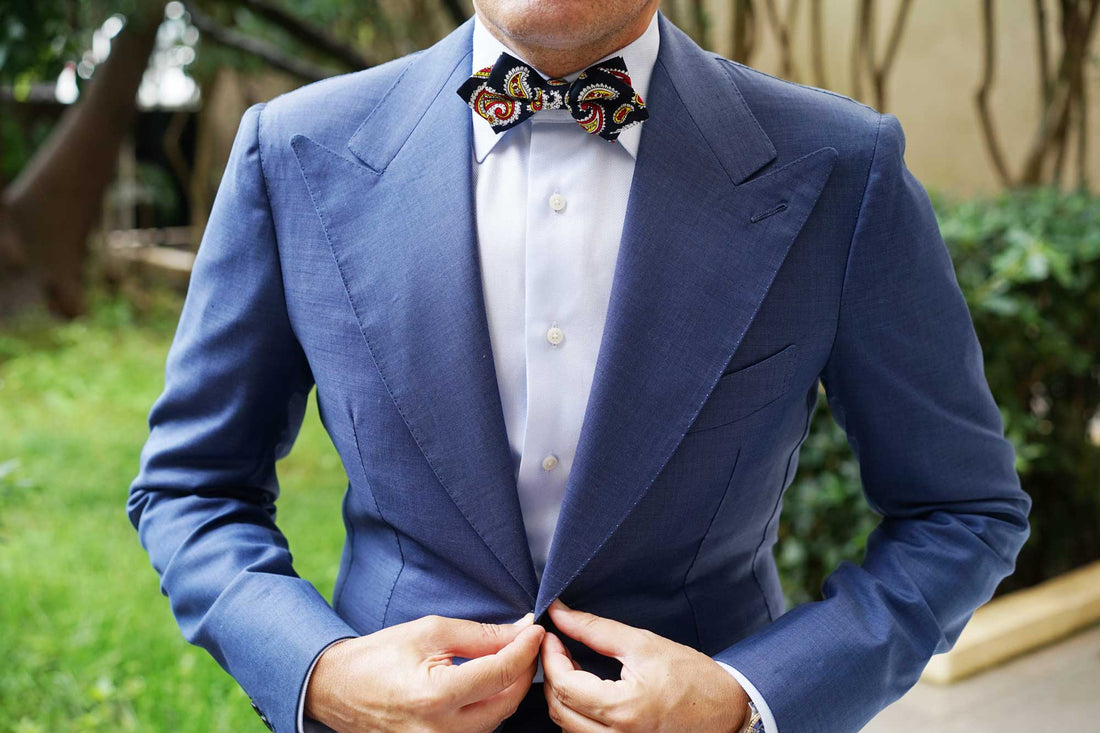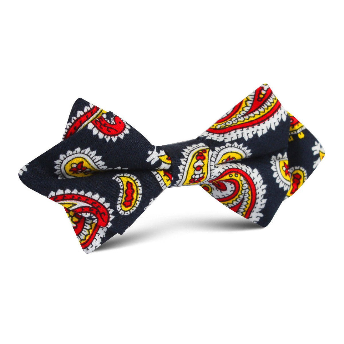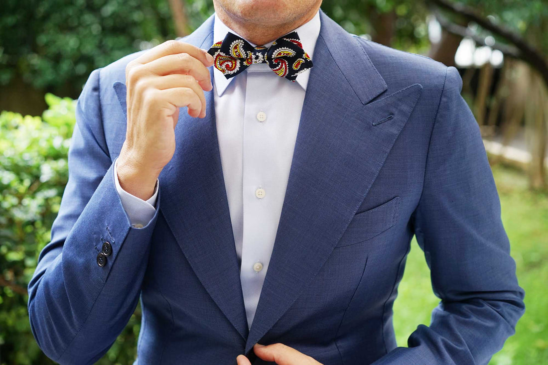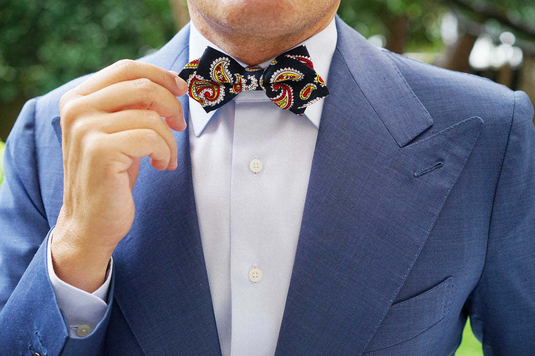 To conduct research for this Vulcano Red & Yellow Paisley Diamond Bowtie, the Brothers at OTAA went snorkelling on the Island of Vulcano in Italy. Inspired by the vibrant fish and exotic corals they saw, this diamond pre-tied bowtie was designed under clearly miserable conditions. After a month’s long research trip, the brothers finally present you with the Vulcano Red & Yellow Paisley Diamond Pre-Tied Bowtie. Now they need a vacation.