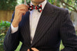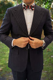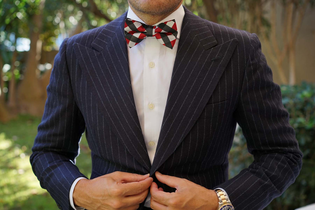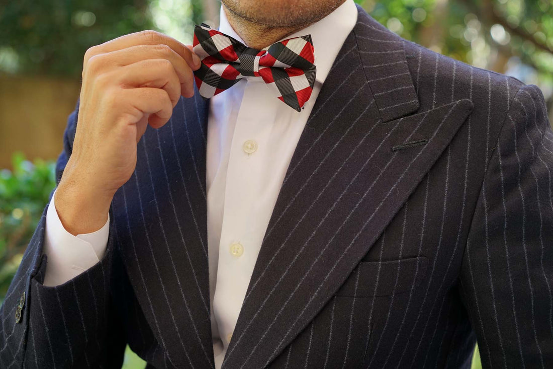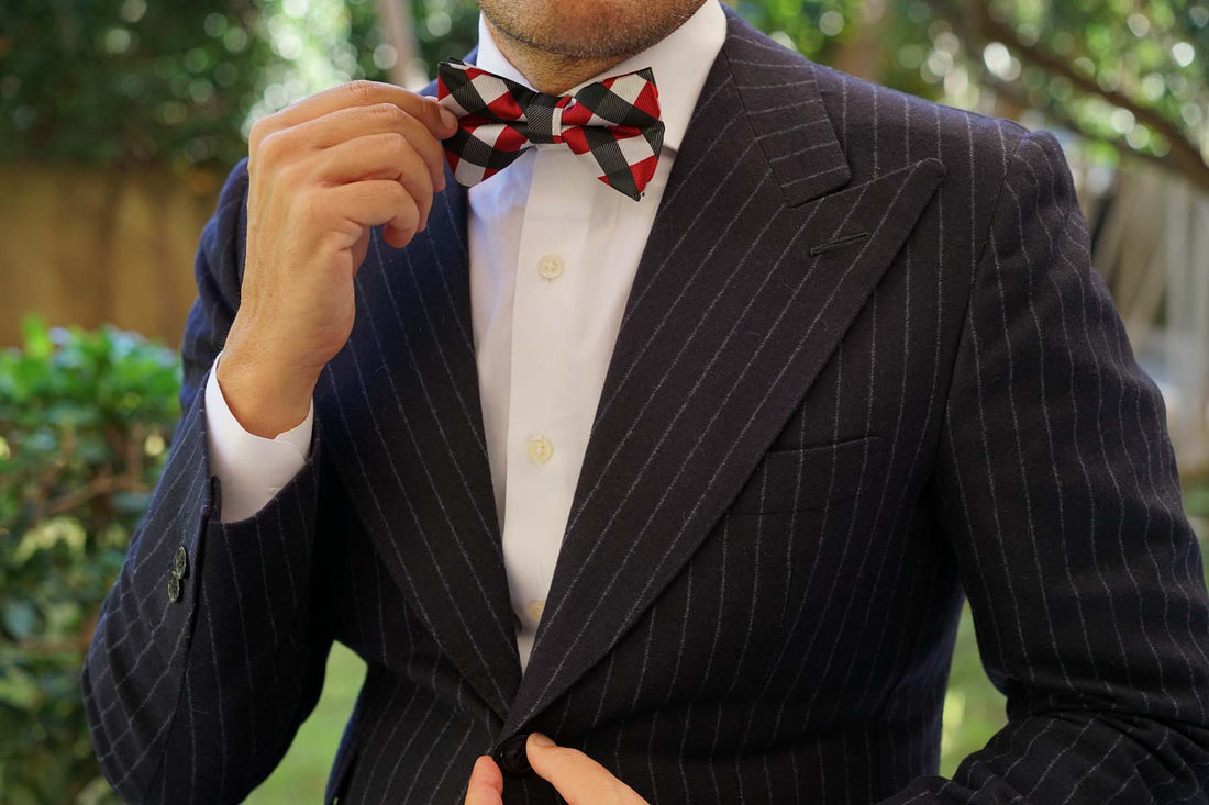 The checkered Bow Tie is made up of stripes ranging from maroon, black and white. This skinny neck pre-tied bow tie for men can be worn with a pocket square with matching fabrics.