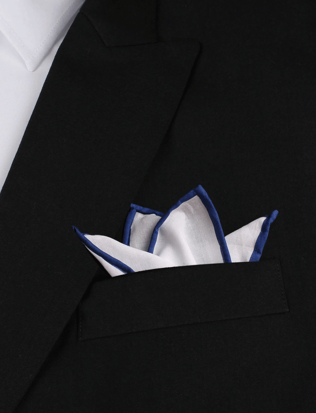 Superbly handcrafted, the White Cotton Pocket Square with Dark Blue Border is a masterstroke of versatility. Showcasing a sophisticated deep blue border and a crisp white body, this White Cotton Pocket Square with Dark Blue Border is a sublime way to achieve a polished look. It will be a perfect compliment to navy blue suits and will bode superbly with a myriad of ties and bow tie styles. The White Cotton Pocket Square with Dark Blue Border has been designed in-house and delicately handcrafted from the finest cotton we could find. Let it give you a perfect polish when it comes to dressing for weddings and formal occasions. Designed exclusively by The Brothers at OTAA.