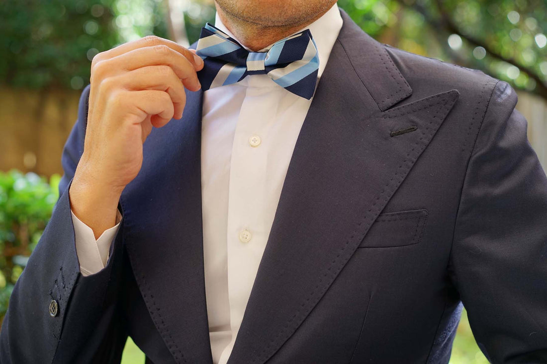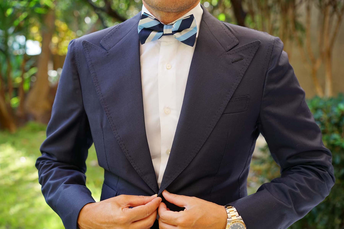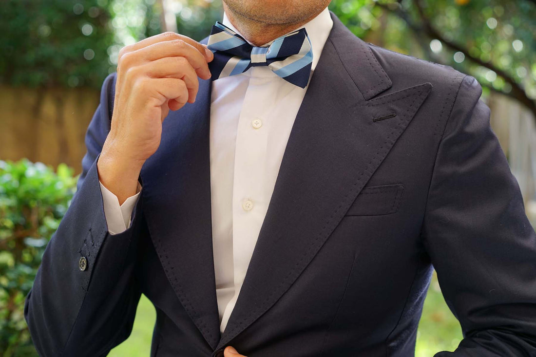 The navy Bow Tie has different shades of blue and white stripes. The thin pre-tied bow tie is designed in Australia and is best worn on a simple shirt to make the Bow Tie colours standout and look bold.