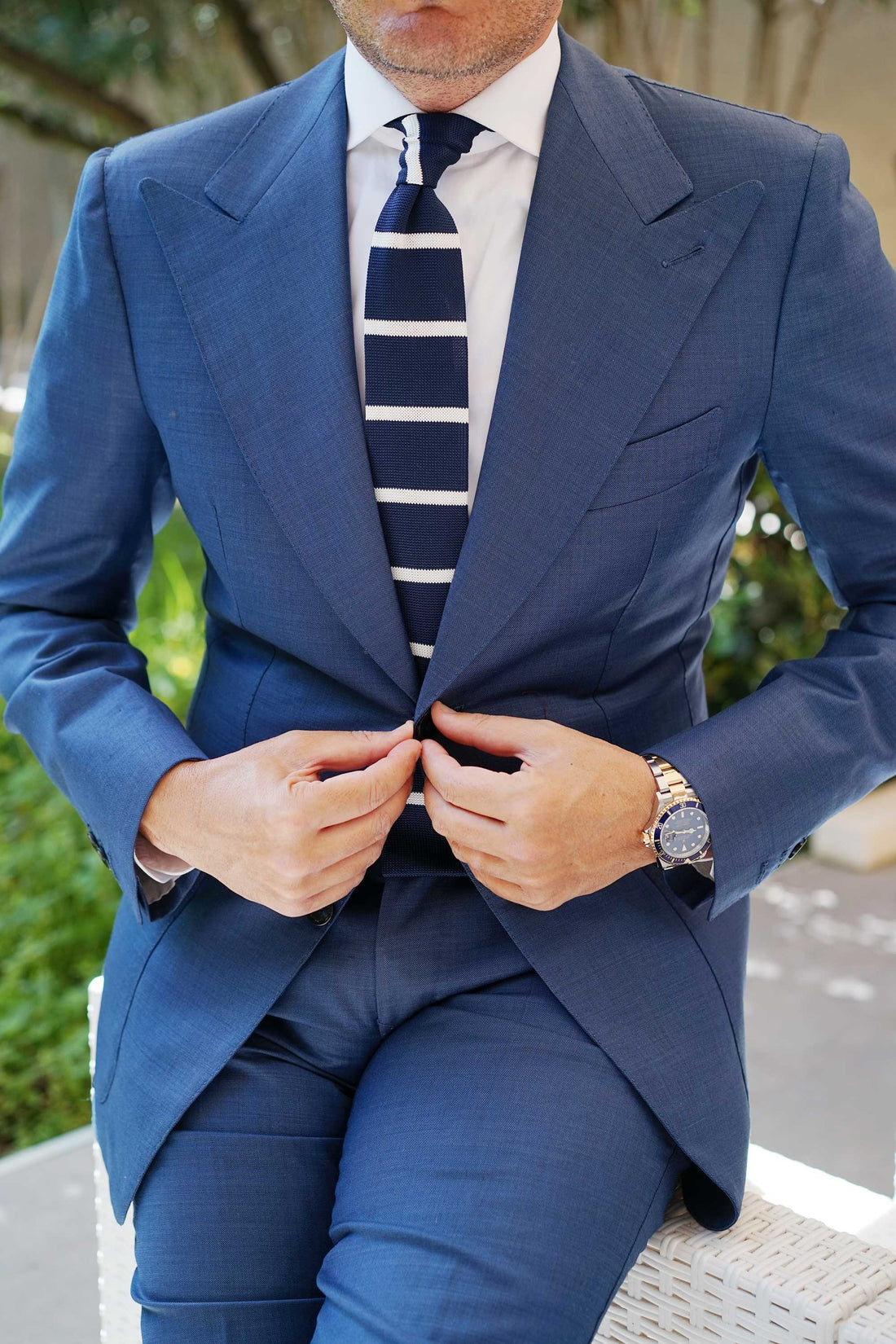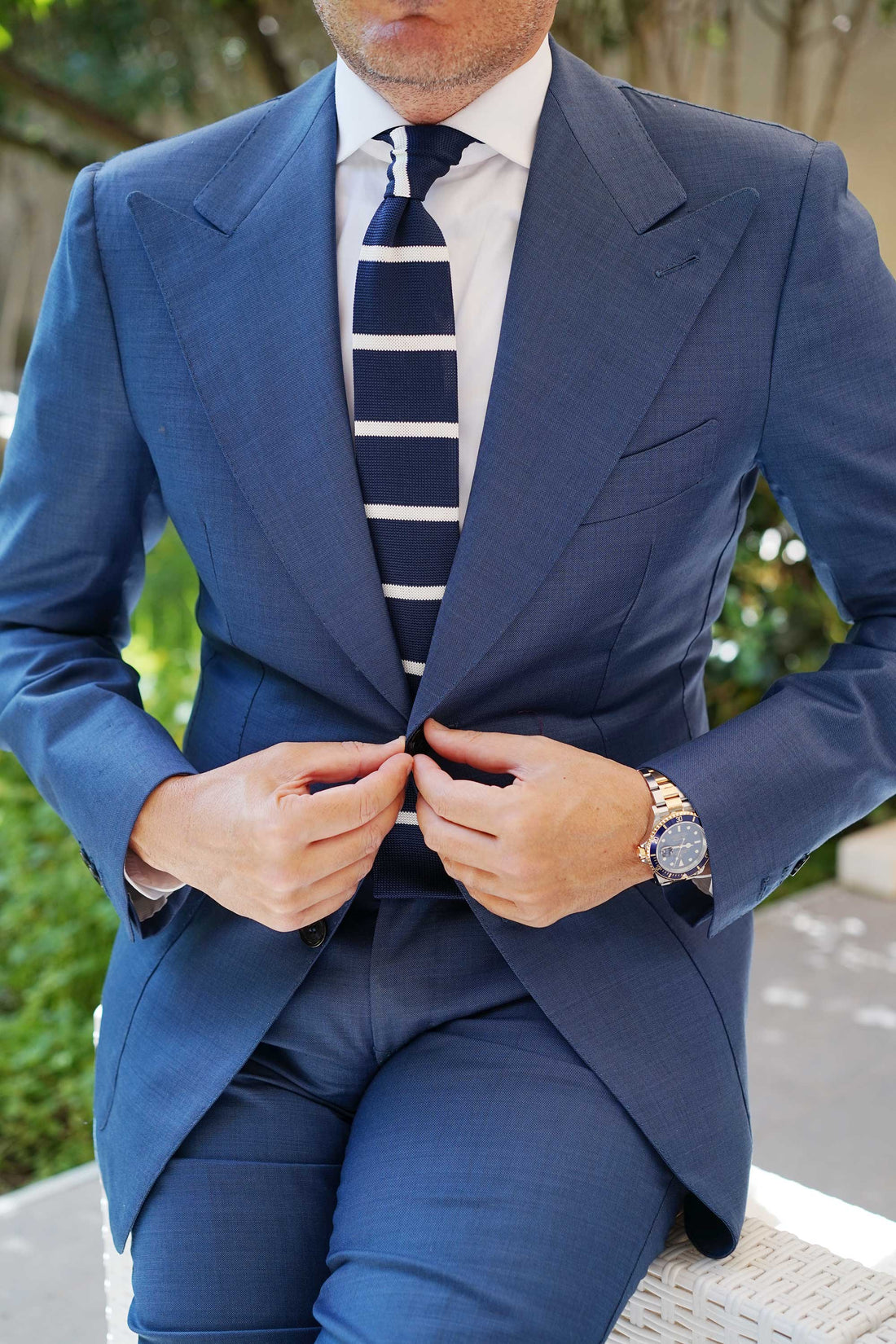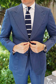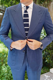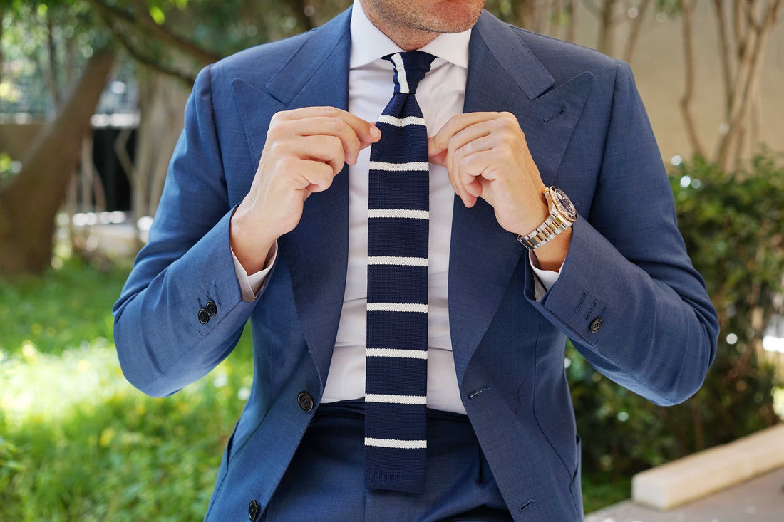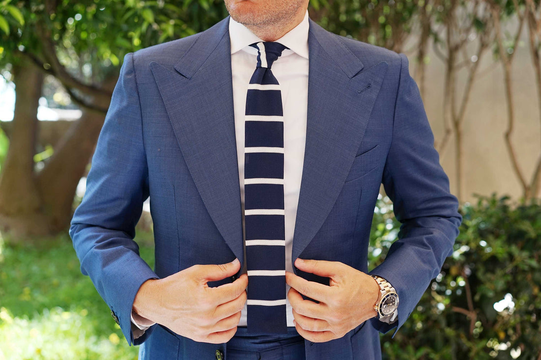 From the man who inspired the Winston Wolfe Navy Blue Striped Knitted Tie, "just because you are a character, doesn't mean you have character". Inspired by the man from Tarantino's Pulp Fiction (1994), OTAA's Winston Wolfe Navy Blue Striped Knitted Tie is brimming with luxurious texture and an indulgent palette. Navy provides a contemporary alternative to all-black ties, and imbues a sense of sophistication without feeling too classic. Paired in this designed with striped white features, this knitted tie boasts an intricate accompaniment to your formal tailoring. The Winston Wolfe Navy Blue was designed exclusively in-house and with a plush handwoven body, its quality is unmistakable. Pair this knitted tie with a smart blazer to accomplish a sleek aesthetic.