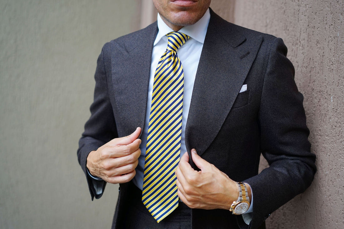 As the slightly smarter take on the necktie, the Yellow and Navy Blue Diagonal Necktie is the pinnacle of classic off-duty style. This navy and yellow striped version from OTAA is hand crafted and finished with a bumble bee pattern embroidered for a signature style. Wear it with streamlined corduroy trousers and a lightweight blazer for a winning combination.