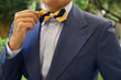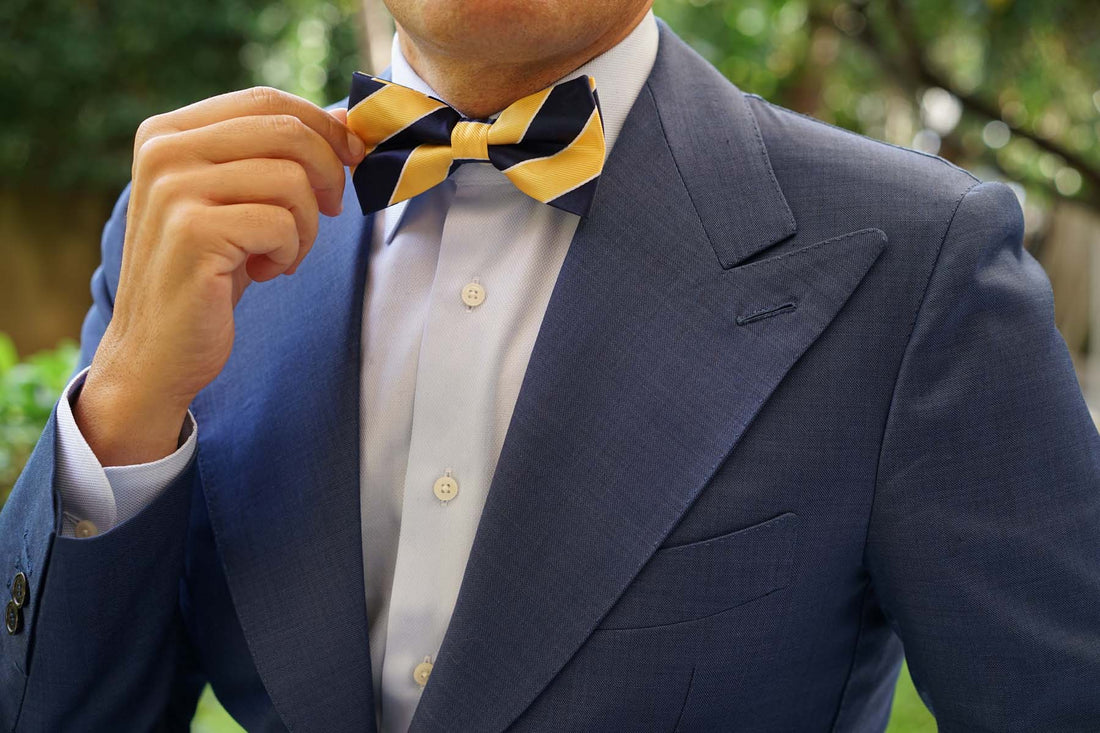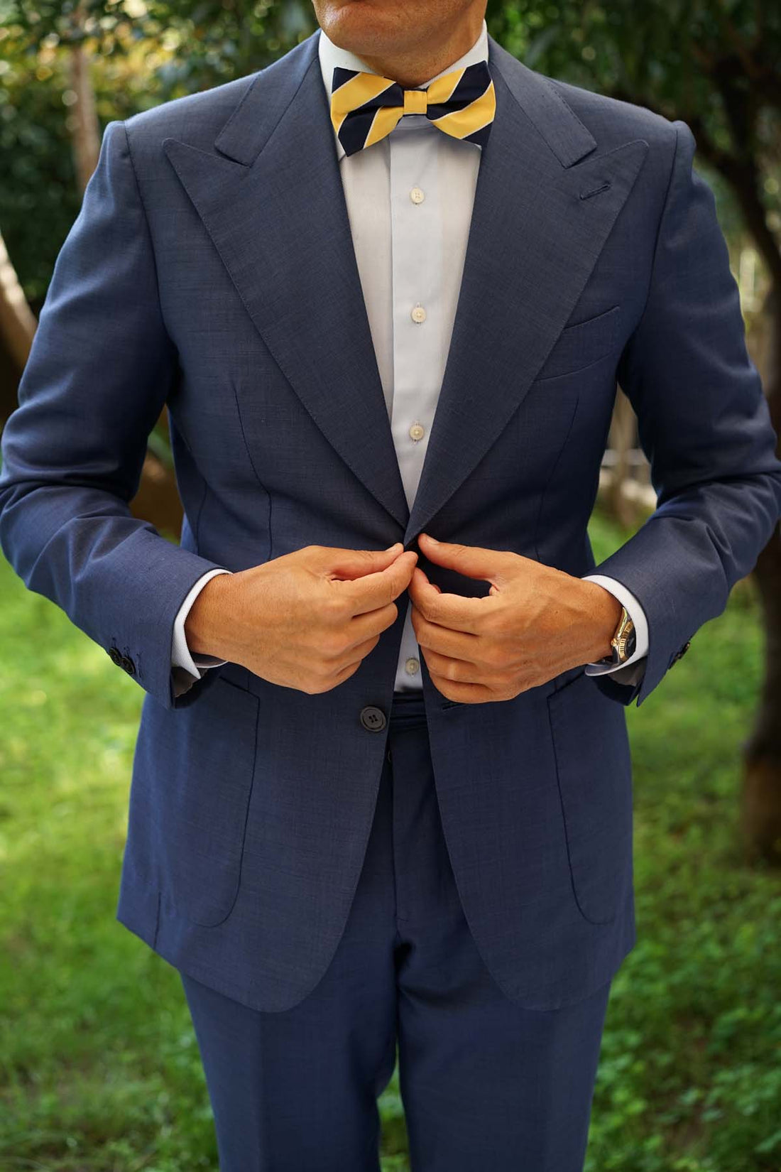 The Yellow and Navy Blue Striped Bow Tie is a classic colour combination. The thin yellow design makes a great men’s accessory to any suiting.