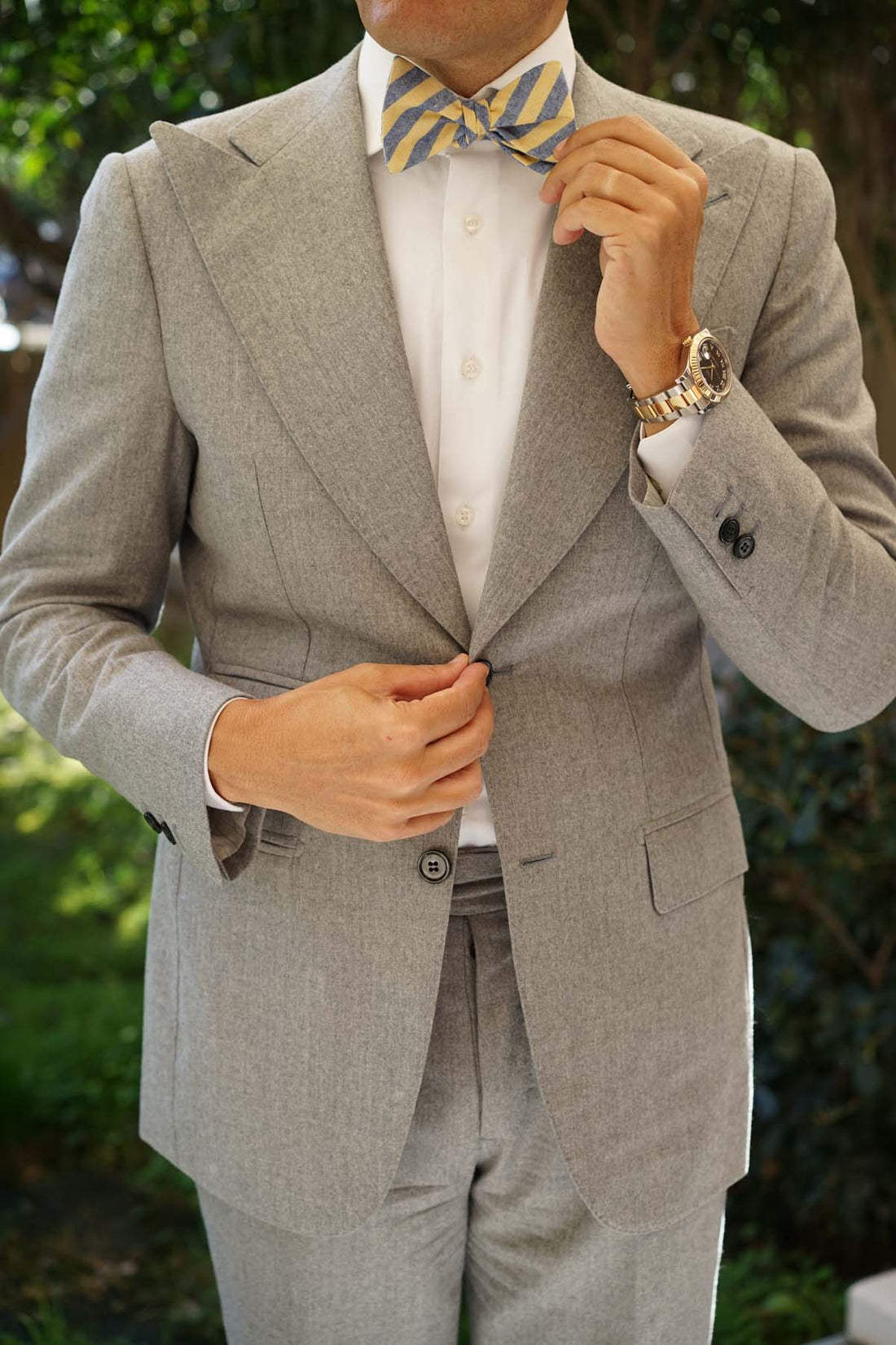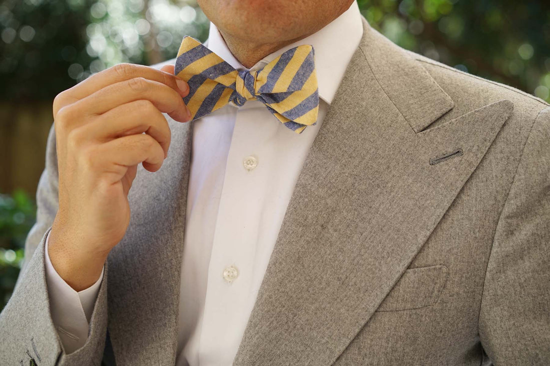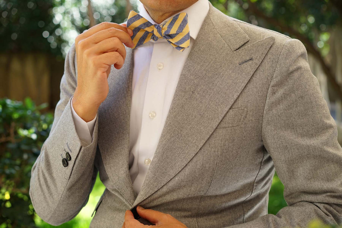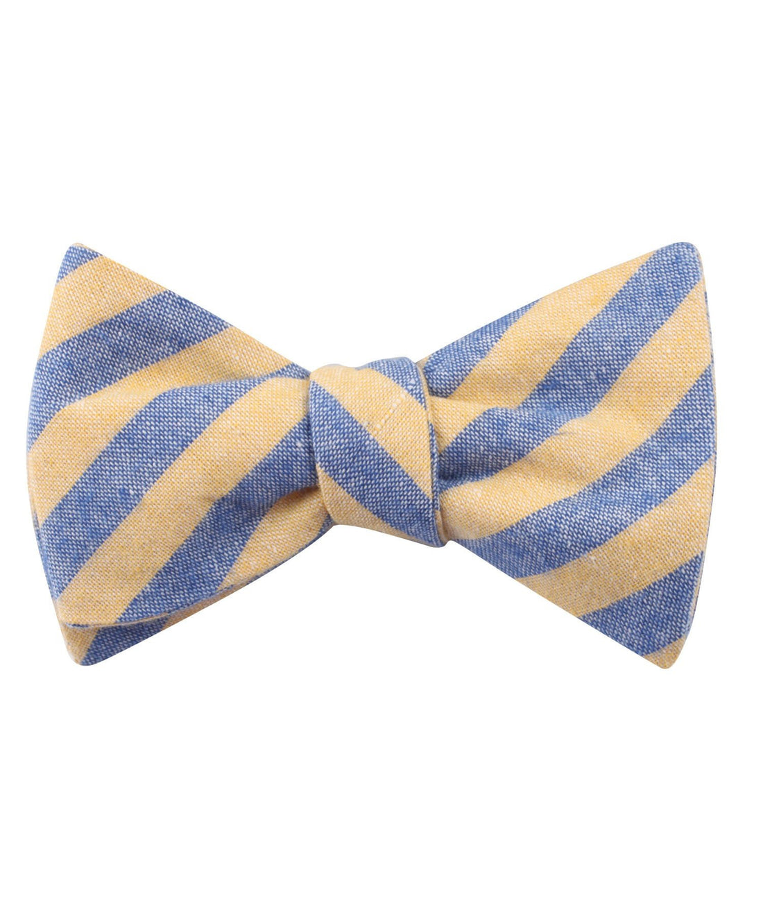 To produce OTAA’s Yellow & Blue Bengal Linen Self Tie Bow Tie, we took a quick trip to the Amazon. We find this aids with the design process. Endeavouring to catch a glimpse of a Bengal tiger up close, we were shortly informed by a local tribe that Bengal tigers don’t actually live in the Amazon. We were feeling slightly disheartened and ready to go home, when suddenly; a colourful yellow and blue bird caught our eye. Inspired by the Bengal tiger and a really cool bird, OTAA presents the Yellow & Blue Bengal Linen Self Tie Bow Tie.