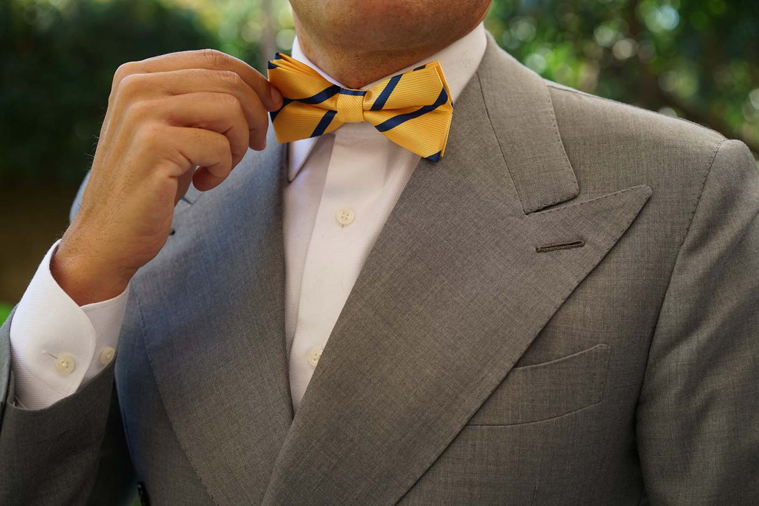 Textured with luxurious horizontal lines and a luxuriously smooth body, the Yellow Pencil Stripe Pre-tied Bowtie emanates a sophisticated presence as part of suit ensembles. The ebullient yellow palette is paired with a diagonal navy pattern to provide a confident point of difference. Immaculately hand-stitched and tailored with elegance, this Yellow Pencil Stripe Bow Tie demonstrates the label’s dedication to superior quality. Designed exclusively by the Brothers at OTAA.