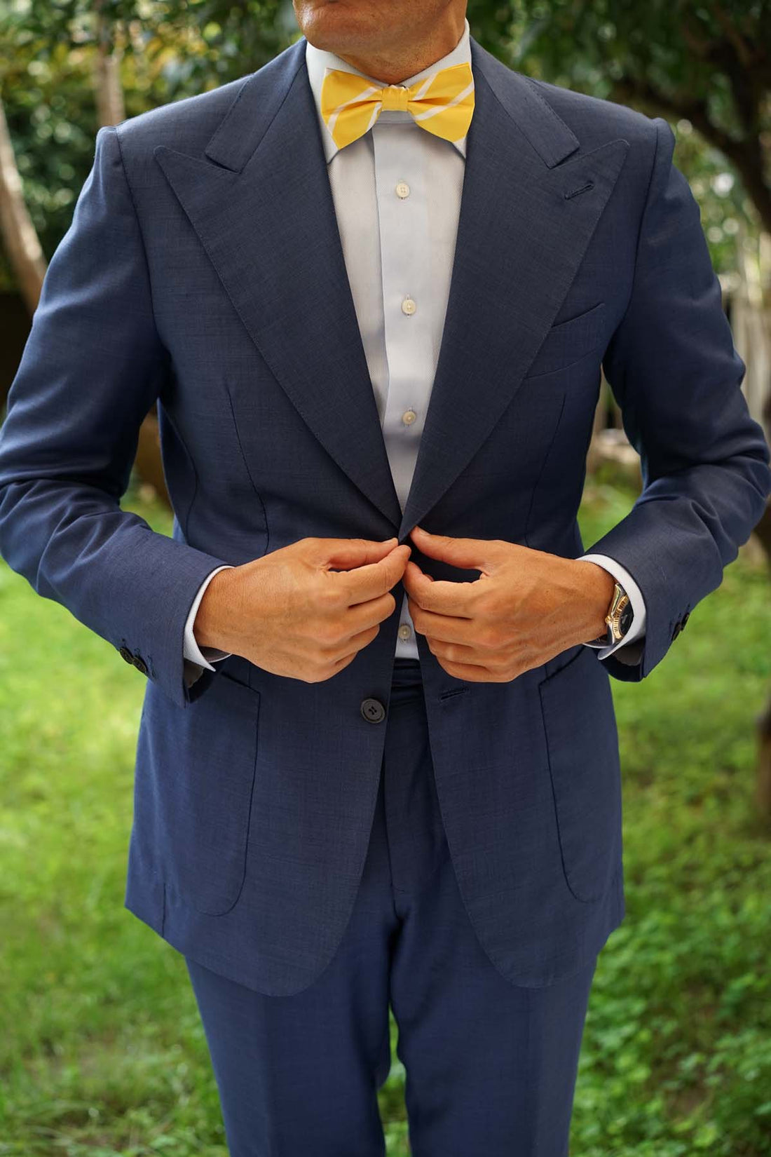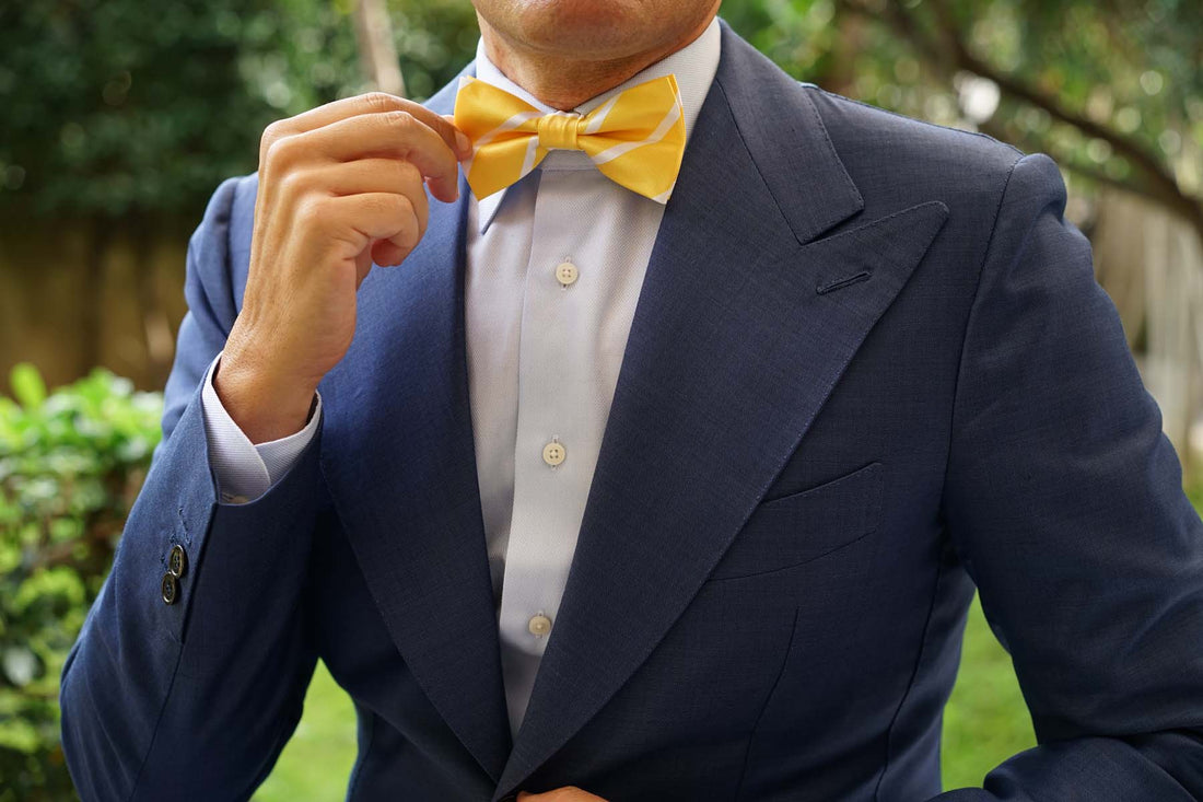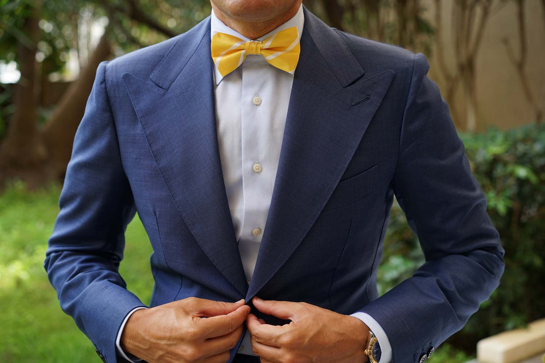 Add a flawless accent to formal styles with OTAA’s exclusive Yellow Striped Bow Tie. The Brothers at OTAA prize world-class tailoring, which is why this pre-tied bowtie is crafted by hand from a fine satin cloth. The sumptuous design is complemented by white diagonal stripes and a lined textured surface. The Yellow Striped Bow Tie is superbly finessed with a vivacious yellow palette to give your formal styles a confident accent. Designed exclusively by the Brothers at OTAA, the Yellow Striped Pre-tied Bowtie is an unparalleled choice for sophisticated style.